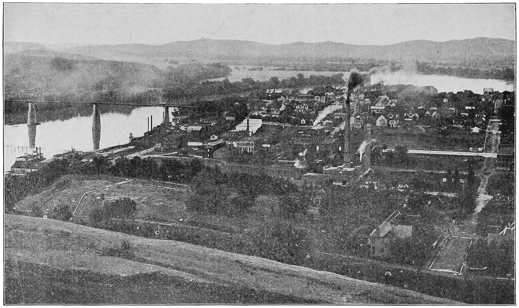 By the river is a steep, high ground known as Cameron hill. Let us go up to the top and look around. Stretching away at our feet on the east is Chattanooga. Part of the city as we see it from Cameron hill is shown in the picture (Fig. 70). Beyond is the Tennessee, and we are looking up the river to the northeast. The bridge which we see is the only bridge across the river at Chattanooga, even though it is now a large and busy city. In the distance is high ground, a part of Missionary Ridge, famous in the story of the Civil War.