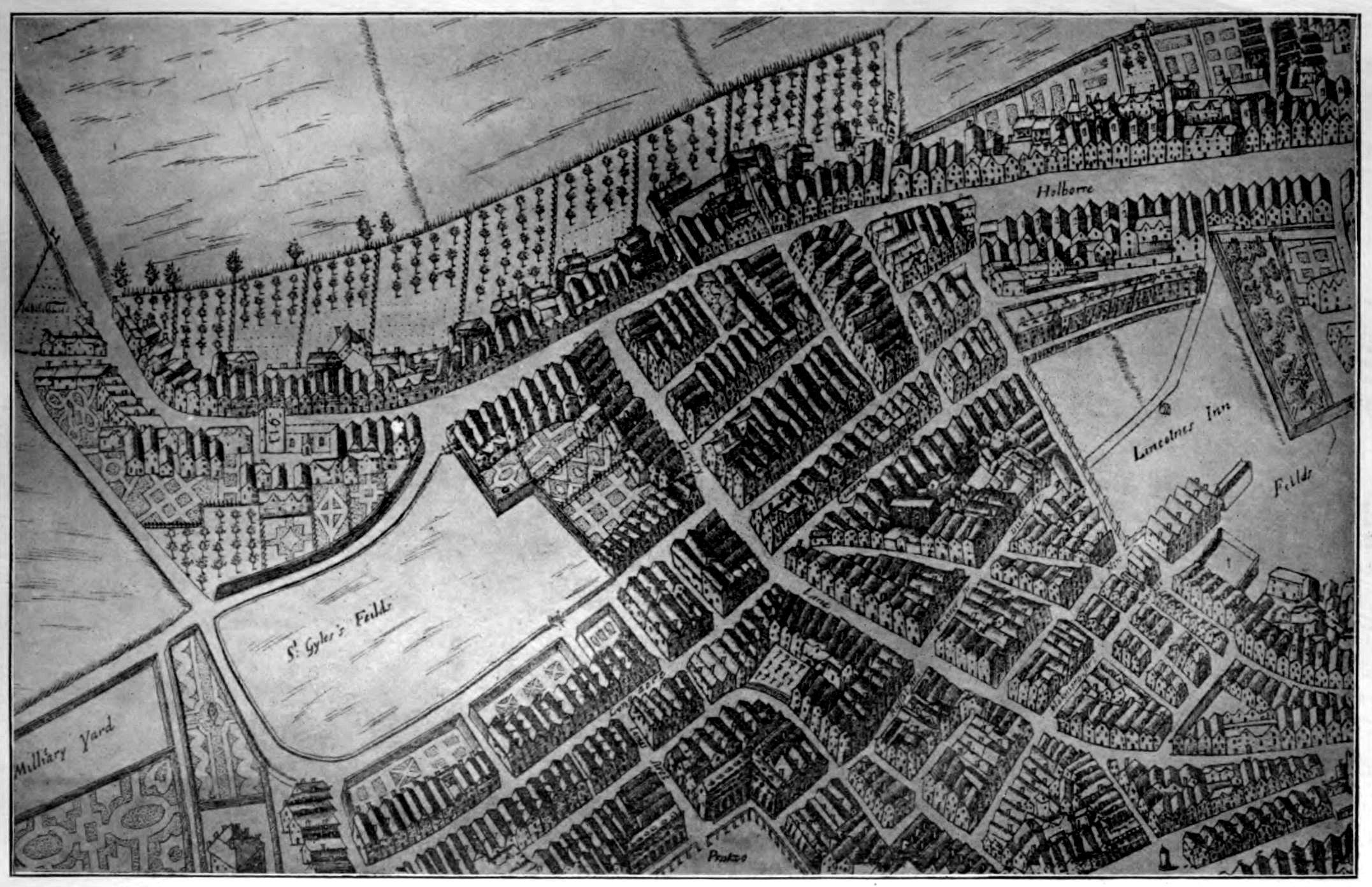 | 3. | Extract from Map by Hollar of the area now forming the West Central District of London, showing the neighbourhood of St. Giles-in-the-Fields circ. 1658. | |