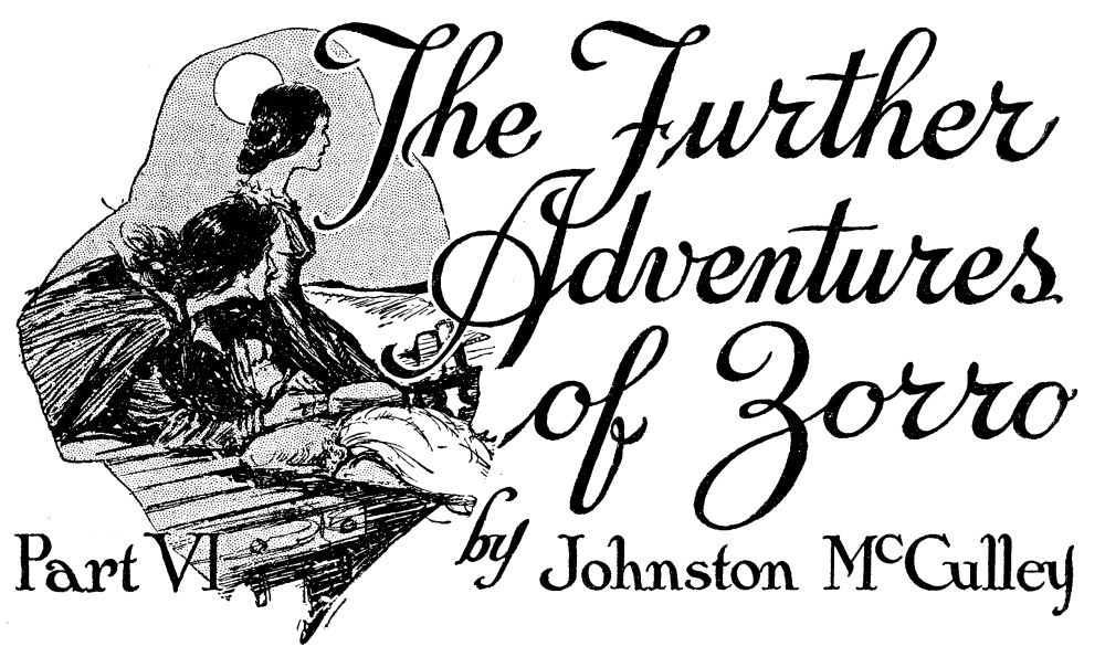 “Yet, I am not sorry for what has happened,” said Señor Zorro. “It has brought us closer together. Peril knits hearts, señorita.”