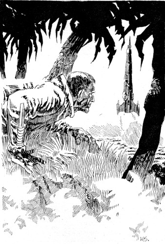 Apparently deciding that nothing dangerous flew or crept in the vicinity, the spacer returned to the base of the ladder to remove his suit. He dropped it there, hitched at his belt—suggesting to Quasmin the weight of a weapon—and began to stroll across the turf of springy creepers toward the wreck. Quasmin followed as sneakily as he could.
