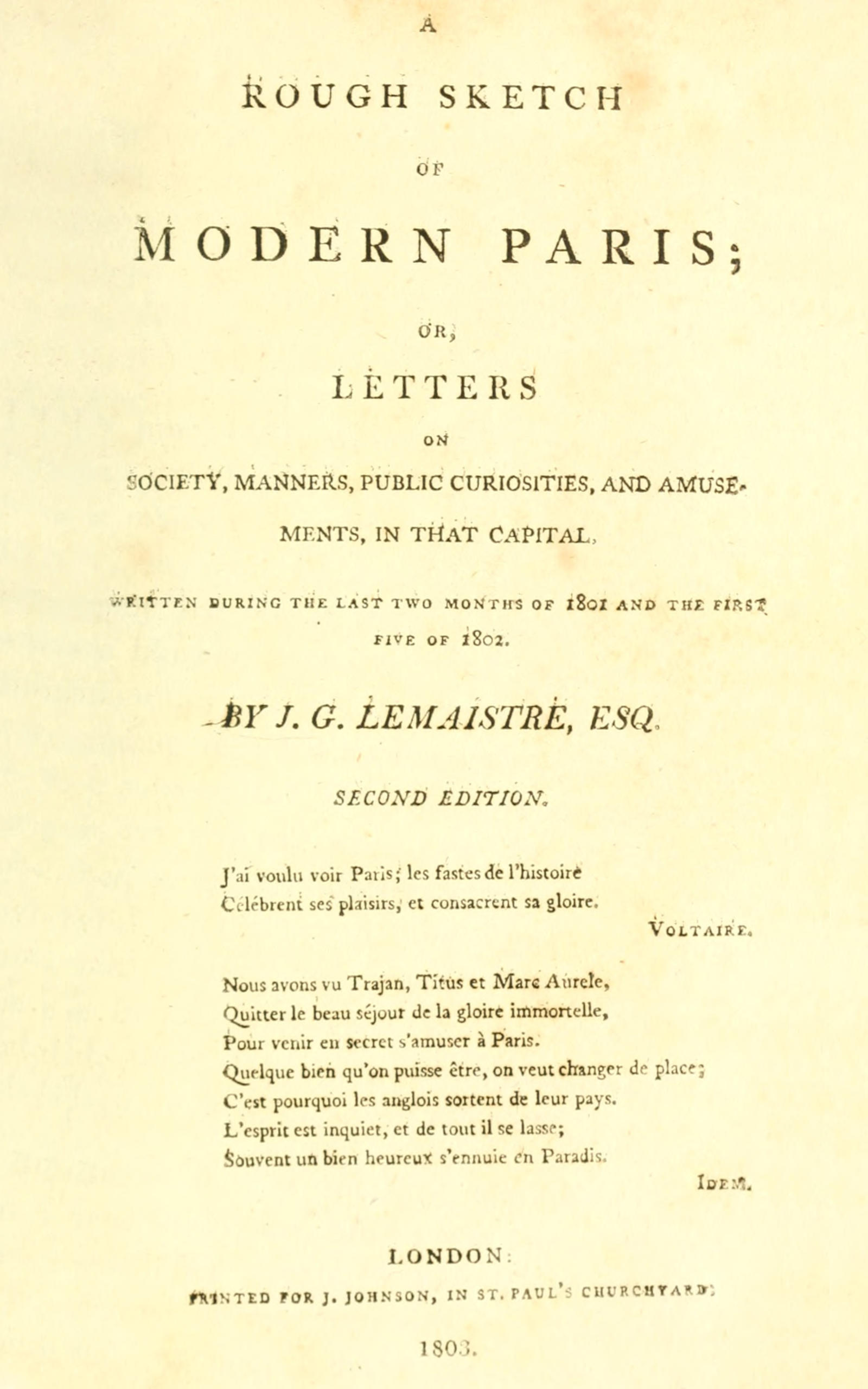 To conclude—The intention of this work being simply to describe the internal situation of the french capital, all religious and political discussions will be avoided. The causes, events, and consequences of a revolution, which has no parallel in history, I leave to abler and more experienced writers. To point out to strangers the objects most interesting at Paris, to convey some previous information to those who intend going thither, and to lay before such as are prevented, by their other occupations, from undertaking the journey, an account of the pleasures, festivals, buildings, and mode of living in that metropolis, is the task I have undertaken, a task which, however comparatively humble, is neither useless nor unimportant. Had it fallen into other hands, the public would feel the truth of this remark. As it is, I fear they will easily discover, that the subject deserved an abler pen.