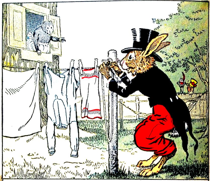 “Why, Uncle Wiggily!” cried Nurse Jane, as she looked out the window. “You’ll let all my nicely washed clothes down in the mud if you loosen that line! Please stop!” Uncle Wiggily stopped, but he said: “I want a bit of line to go fishing with, Nurse Jane. You have more than you need here.” The muskrat lady laughed. “I’ll get you an extra piece that has no clothes hanging on it,” she said. “But aren’t you afraid the sharp hook will hurt the fish you catch?” Uncle Wiggily shook his head. “I’m going to use a smooth hammock hook,” he said.