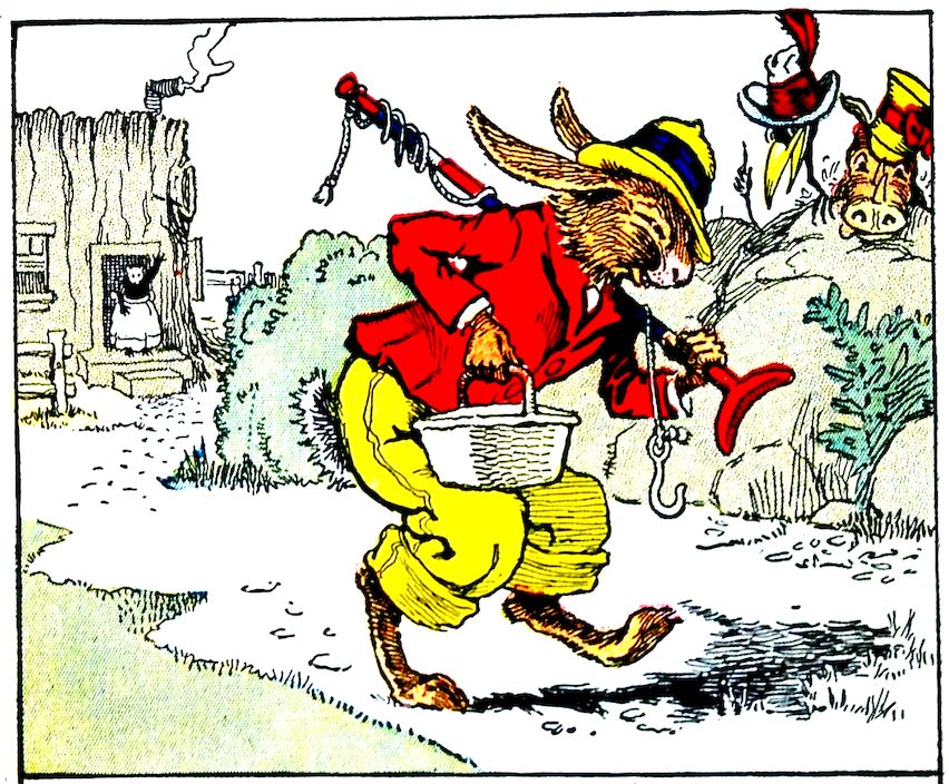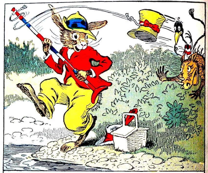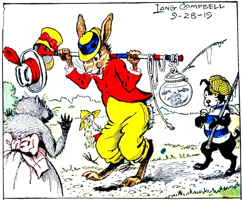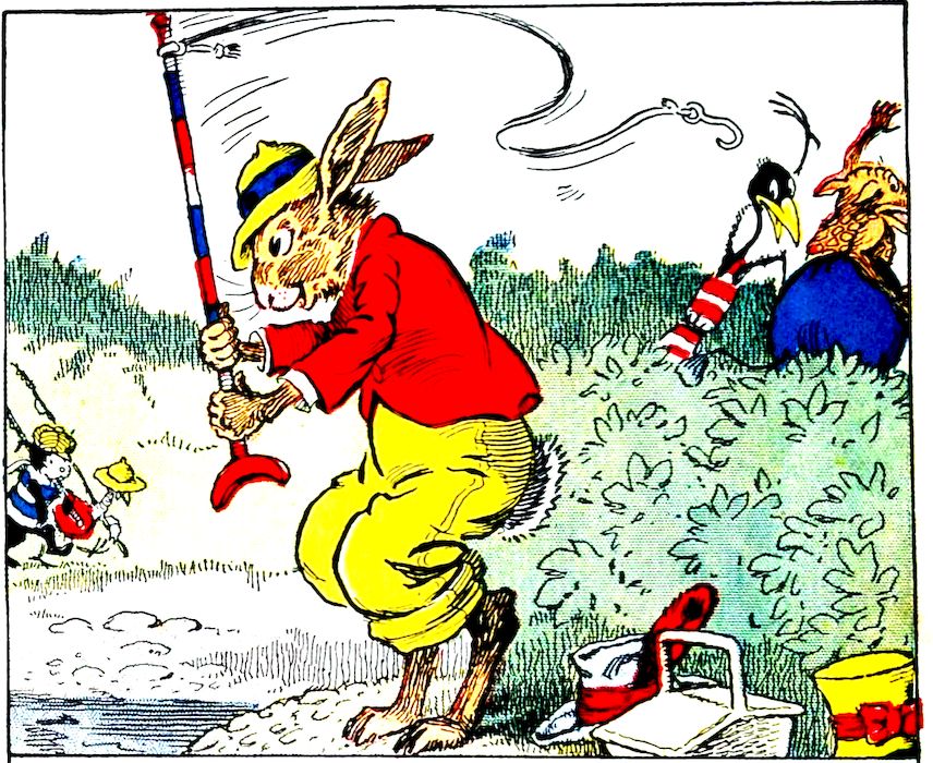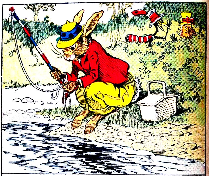 “Where are you going, boys?” asked Uncle Wiggily Longears, the bunny rabbit gentleman one day, as he stood in front of his hollow stump bungalow. Nurse Jane was on the steps, shaking the wrinkles out of the table cloth. Going past, with poles over their shoulders, was Jackie Bow Wow, the puppy dog boy, and Charlie Chick, the little rooster chap. “Where are you going?” Uncle Wiggily asked them. “Fishing,” answered Jackie. “Don’t you want to come?” crowed Charlie, the rooster. “Yes, I think I might go, later on, perhaps,” said Uncle Wiggily.