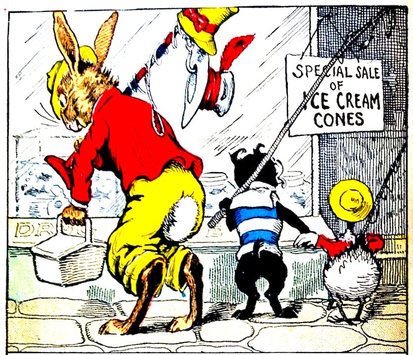 “Oh, Uncle Wiggily! Look!” cried Jackie Bow Wow, as he and the bunny gentleman and Charlie Chick stopped in front of a drug store on their way home from the fishing trip. “Look! Special sale of ice cream cones!” Charlie Chick said: “I wonder how they taste?” Uncle Wiggily, who had not caught any fish, any more than had the puppy and rooster, sort of blinked his eyes. “I wonder how much those gold minnows are?” he said to himself. “I’m going in and ask. I guess I can buy gold fish with silver money. And we’ll see about some ice cream cones, too!”