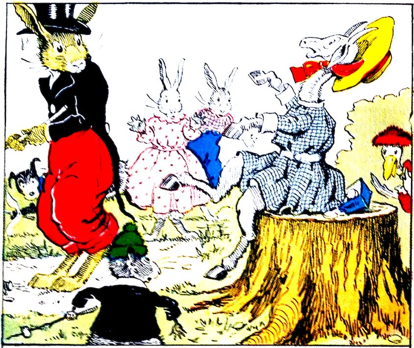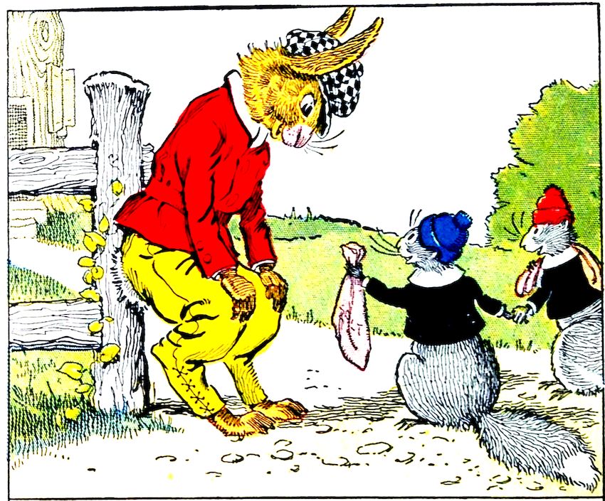 Uncle Wiggily Longears, the bunny rabbit gentleman, leaned on the gate in front of his hollow stump bungalow one day. He was all dressed up to take a walk, but didn’t know where to go. All at once he saw Johnnie and Billie Bushytail, the two squirrel boys. “Where are you going, Johnnie and Billie?” asked the bunny uncle. “We are going to the woods for some chestnuts and hickorynuts,” answered Johnnie. “Mother puts them in our cake.” Uncle Wiggily said that was fine. “I wonder if Nurse Jane will bake a cake if I get some nuts?” said Uncle Wiggily.