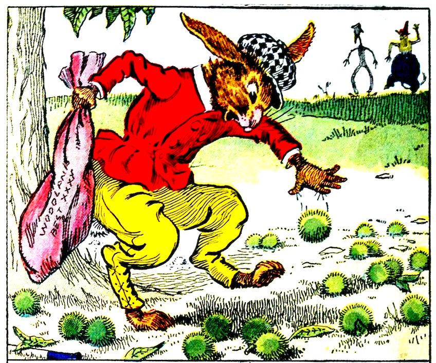 Uncle Wiggily hopped and jumped through the woods, with the empty flour sack over his shoulder. He was thinking how good the nut cake would taste when, all of a sudden, the bunny rabbit gentleman came to a big pile of chestnuts under a tree. The wind has blown them down, but they were still in the stickery, prickery burrs, Jack Frost not having cracked them open. Uncle Wiggily did not know as much about chestnuts as did Johnnie and Billie, the squirrels, and picked up the nuts with his bare paws. “Ouch,” he cried. “I’m stuck full of splinters!”