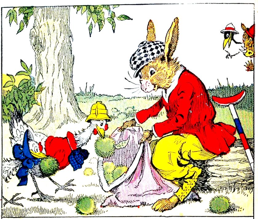 While Uncle Wiggily was wondering how he could fill his bag with chestnuts, and not get the stickers in his paws, along through the woods came Charlie and Arabella Chick, the little rooster boy and the little hen girl. “Oh, Uncle Wiggily!” crowed Charlie, “Arabella and I will pick up the stickery chestnuts for you in our beaks. They won’t stick us!” Uncle Wiggily said that would be very kind. So, while the bunny held open the bag, Charlie and Arabella filled it with the prickly chestnuts. And what do you suppose the Pipe and Skee are going to do?