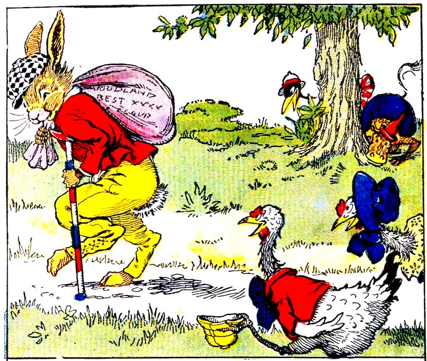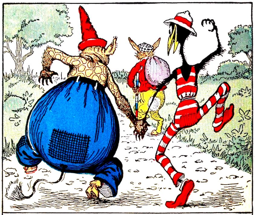 “Good-bye, Uncle Wiggily! Good-bye!” crowed Charlie the rooster chap, as the bunny rabbit gentleman’s bag was filled with chestnuts, and he started for his hollow stump bungalow. “Good-bye!” answered Uncle Wiggily. “When Nurse Jane bakes the nut cake, I’ll save you each a piece for having so kindly helped me!” The Pipsisewah, hiding behind a tree with the Skeezicks, heard what the bunny said and cried: “He must have a cake in that bag! When he isn’t looking, I’ll tear the bag open with my claws and the cake will fall out!”