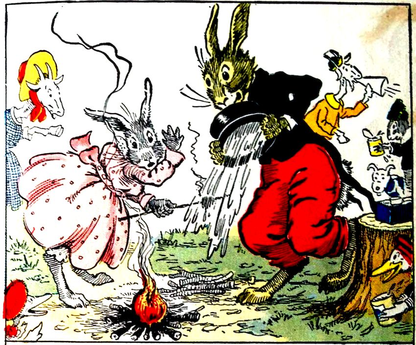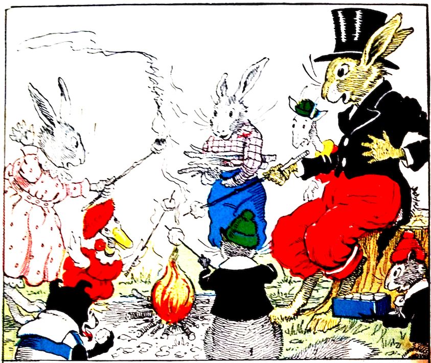 “Dear me! What’s all this?” asked Uncle Wiggily Longears one day, as he sat in his hollow stump bungalow reading the paper. Into his sitting room came Sammie and Susie Littletail, the rabbits; Johnnie and Billie Bushytail, the squirrels; Lulu, Alice and Jimmie Wibblewobble, the ducks; Jackie and Peetie Bow Wow, the puppy dog boys, and Nannie and Billie Wagtail, the goats. “What’s the matter?” asked Uncle Wiggily. “Will you please come to the woods and help us roast marshmallow candies?” asked Sammie. “I will,” said Uncle.