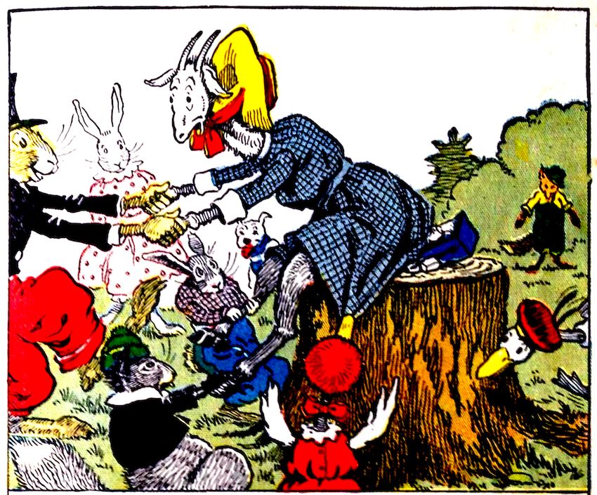 “Now, all together! Pull!” cried Uncle Wiggily, when they had taken hold of Nannie, the goat girl. “Pull hard, everybody!” said the bunny rabbit gentleman, “and we’ll soon have Nannie loose from the sticky marshmallows. You shouldn’t have left them there, Billie.” The squirrel boy said he was sorry. Then, with laughter and shouts, they all pulled, one, two, three! Nannie slowly came loose from where she was stuck on the stump. Over in the woods, the bad old fox tramp heard the noise. “I must see what that is,” he said.