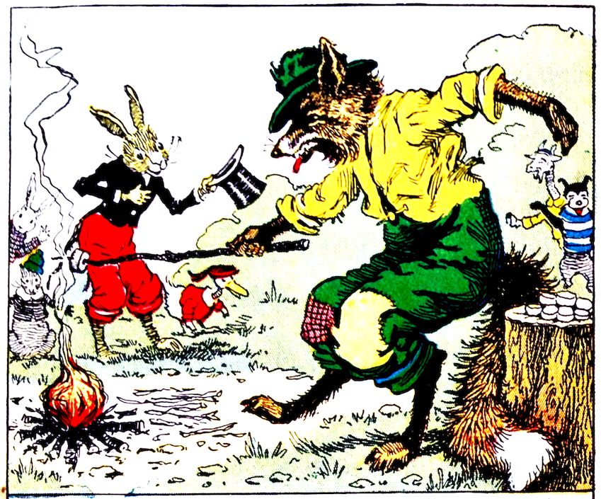 All of a sudden, just as Uncle Wiggily and the animal boys and girls were going to start roasting marshmallows again, right through the bushes jumped the bad old fuzzy tramp fox. Susie’s candy-fire had been put out, Nannie had been pulled loose from the stump, and here was new trouble. “How dare you roast marshmallows in my woods?” growled the fox. “We didn’t know these were your woods,” spoke Uncle Wiggily, politely. “Well, they are!” grumbled the fox. “And, just for that, I’m going to bite a lot of souse off your ears.”