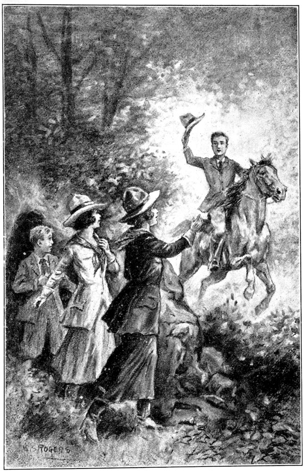 The men out of sight beyond the huge rock, Dorothy and Tavia rushed to the cave mouth, leaving poor Joe to limp painfully after them, 238just in time to see the knaves disappear among the trees.