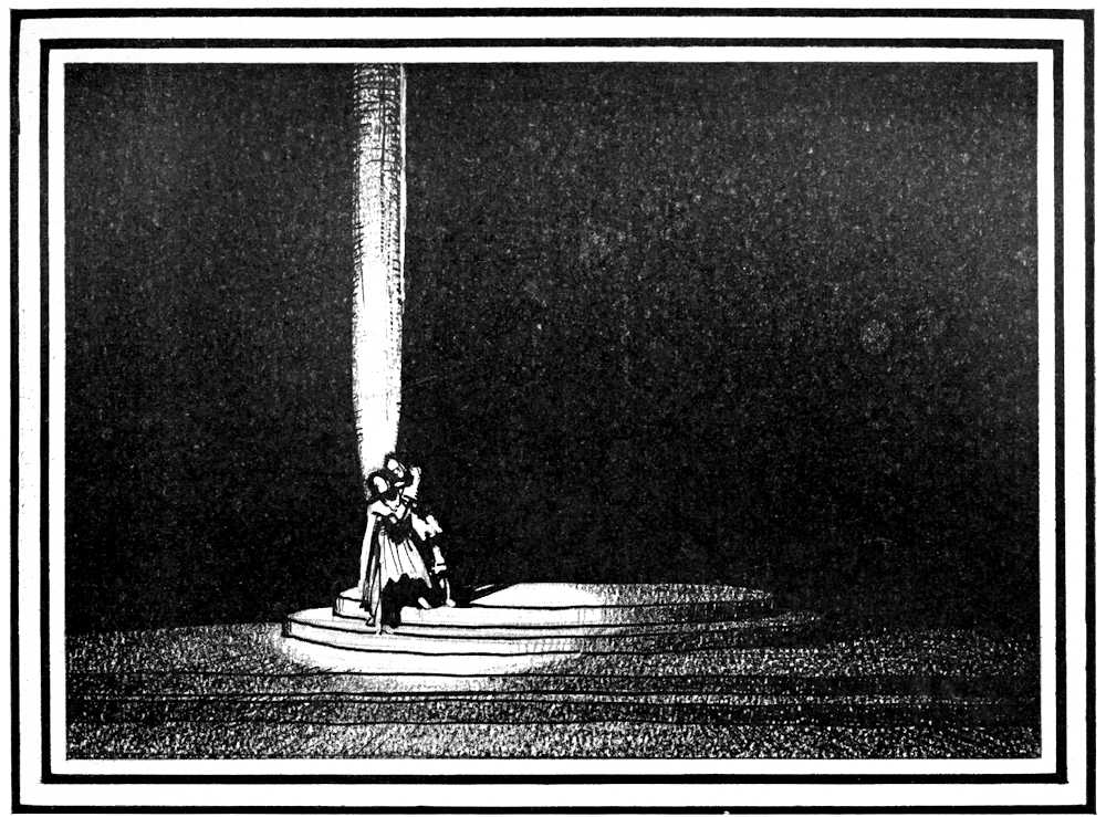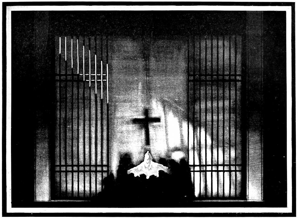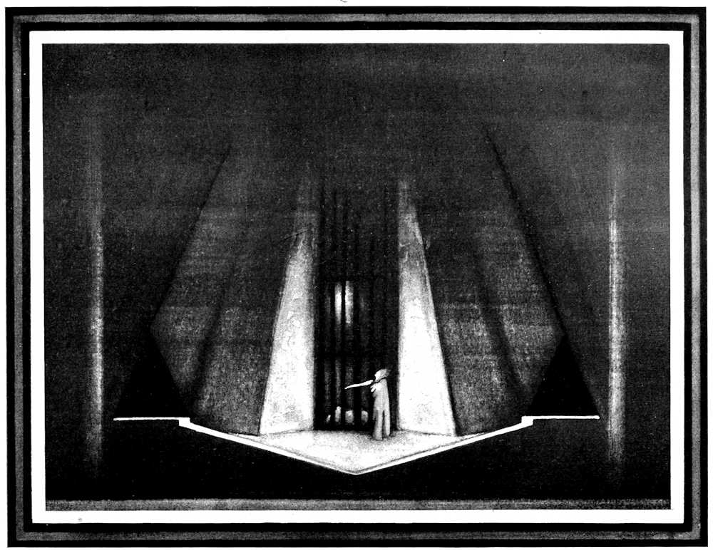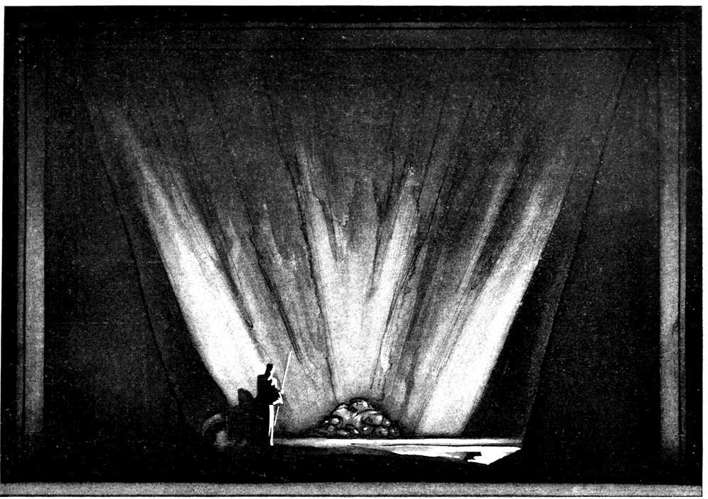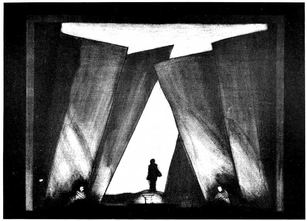 | From Appia’s theories of the ’nineties to the day of projected scenery. Lamps of six thousand candle-power. Color comes under control. The dome no longer a sky; a neutral boundary in Jessner’s Othello, a void in Masse-Mensch, a wall to be painted with light in a Stockholm ballet. Settings projected by Linnebach and Hasait. Light as a dramatic motif. | ||