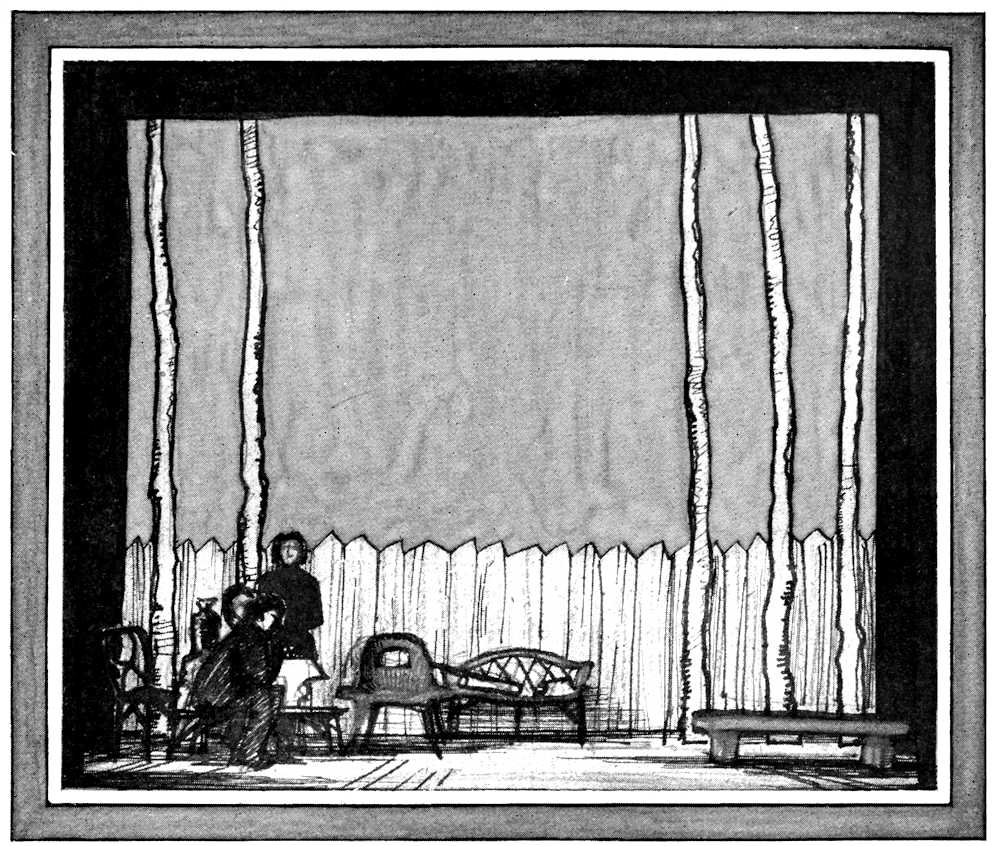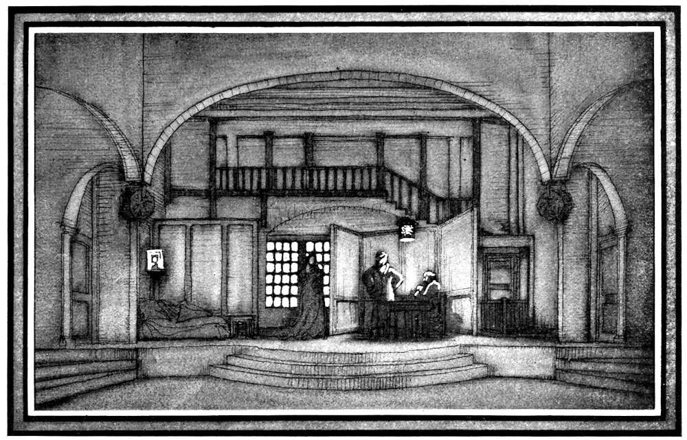 The permanent setting, like the theater itself, is an experimental product of the attempt to provide what the actors need. It is really no more than a balcony placed against the back wall, with an arched opening in the middle, and with walls at the sides that let the actors, who have gone out through the arch, get off stage unseen. This balcony is so solidly built that it cannot be taken out, but certain portions are alterable. The changes in setting are managed by changing the width of the arch or the line of the top of the balcony, by adding doors, steps at one side, or railings, and particularly by placing significant properties or screens upon the stage. Louis Jouvet, stage director as well as Copeau’s best actor, has done many ingenious things to make his settings varied enough and characteristic enough without losing the permanent thing that is common to them all, and that aids in banishing realistic illusion. A detail that shows the working of his mind is to be found in the screens that he uses to create a room in Les Frères Karamazov; by giving them two or three inches of thickness and a certain [Pg 175]amount of molding, he has escaped the impression of the bare, the unsubstantial, and the untheatrical which the screens of other designers produce.