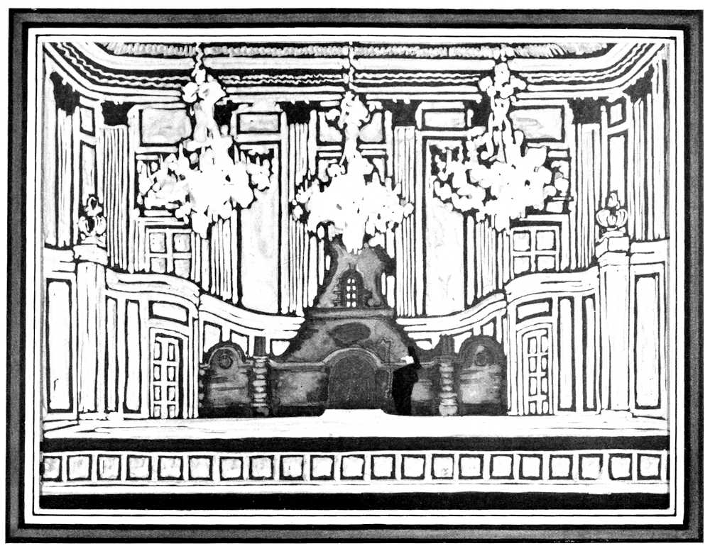 They had paid good money at one of the doors of that extraordinary old building, the Hofburg, which rambles from the[Pg 185] Opera to the Burgtheater half across the shopping district of Vienna. After they had parted from two or three thousand crowns apiece, they had wound up stone stairways between white walls and twists of old ironwork, passed through cloakrooms where princesses once left their wraps, and a supper room where artists may cheerfully go mad over molding, pediment and mirror, and reached at last the Theater in dem Redoutensaal. They found one of the handsomest baroque rooms in Europe holding within its beauty both a stage and an auditorium. A row of Gobelin tapestries filled the lower reaches of the walls. Above were moldings and pilasters, cornices and pargeting, spandrels and pediments, fillets and panelling, an ordered richness of ornament that held suspended in its gray and golden haze mirrors that echoed beauty, and chandeliers radiant with light. At one end of the room, beneath great doors and a balcony which the architect had planned in 1744, was a new structure; it broke the line of the Gobelins, but continued the panelling, freshened to cream and gold, in a curving wall across a platform and in double stairs leading to the balcony. With man’s unfailing instinct for the essence of life, the audience promptly identified this roofless shell as a stage. There was a platform, of course, but there was no proscenium. There were doors and windows in the curving wall, but no woodwings, borders, flats, or backdrops. There was even a something along the front of the platform which might conceal footlights, but[Pg 186] there was nothing to be seen that looked more like scenery than a row of screens.