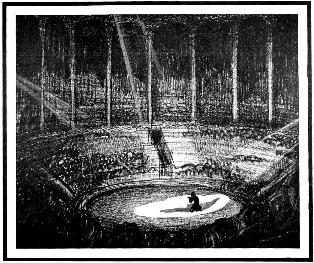 In the “Theater of the Five Thousand” devised by Max[Pg 200] Reinhardt in Berlin, and in the imitation which Firmin Gémier launched at the Cirque d’Hiver in Paris, the audience and the drama at last met in the circus. But for some curious reason—at which I have only guessed in a more or less absurd fashion—neither Reinhardt nor Gémier was courageous or far-seeing enough to use the circus as a circus. Neither dared put the players in the center, and forget the old stage. At one side there always lingered a palace or a proscenium.