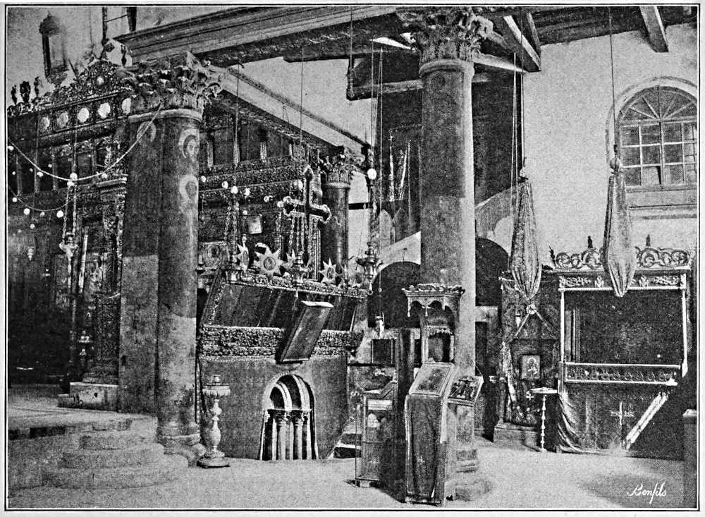 The star is in a little recess at the end of the cave, and above it is an altar, small but very[Pg 173] richly furnished. Of the fifteen altar-lamps of gold and silver which hang around the star, six belong to the Greek, five to the Armenian and four to the Latin monks, who divide in this way the ownership of most of the shrines in the church. The floor of the entire cave is of marble, upon its walls are marbles and rich tapestries, and many lamps hang from the ceiling; yet, on coming from the bright transepts above, the first impression is one of deep gloom. The low roof can hardly be distinguished, and the back of the cave is lost in impenetrable darkness. The smoking lamps give to the atmosphere a heavy, reddish color. The chanting of the priests in the choir overhead is heard only as a dull murmur. We are the only visitors to-day, except that in front of the little altar there kneel four[Pg 174] French nuns, great tears rolling down their pallid faces as they pray in a frightened whisper.