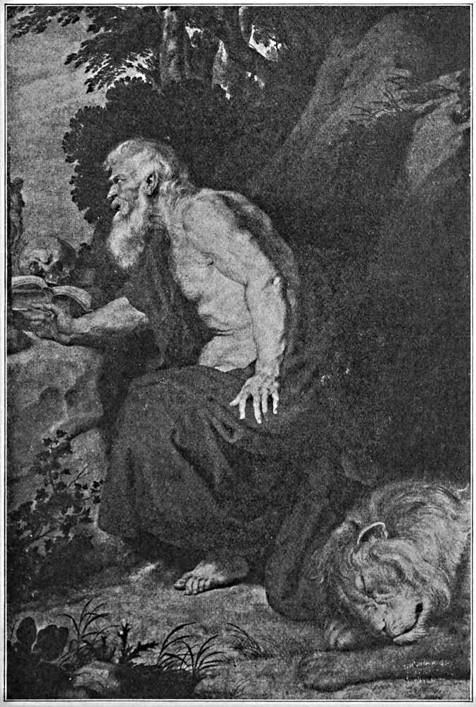 The lion followed Jerome about everywhere like a dog, and slept at the feet of the holy man while he was pursuing his Scriptural studies. Upon occasion, however, the complacent creature was not above minding the monastery donkey when it was put out[Pg 126] to pasture, or even acting as a beast of burden; while at night the fearful roar of the saint’s protector brought terror to the hearts of any evil-doers who might be prowling near the monastery grounds.