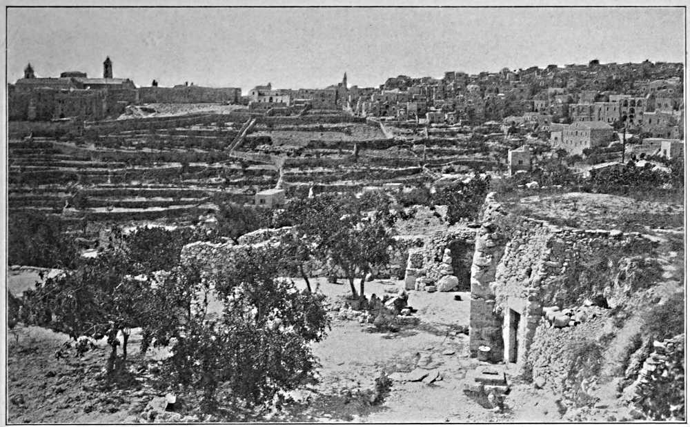 Bethlehem, which is the larger of the two, is built along the summit of a crescent-shaped hill, about two-thirds of a mile long, with its concave side toward the north, so that practically the entire town is spread out before us as we approach it from Jerusalem. At the right-hand horn of the crescent are large, square buildings belonging to various Latin monastic orders. At the left are the dark, heavy walls of the Church of the Nativity, with its low, open belfry. Between these larger structures is a confused [Pg 151]mass of closely-built white houses, whose profile is broken only by the tall, slender spire of the chapel of the German Mission. Immediately in front of us the steep slope of the hill below the town is carefully terraced, and planted here and there with small olive and fig orchards.