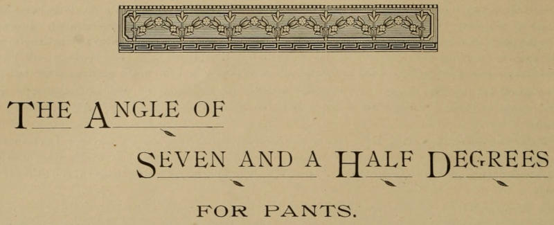 Pants are cut for one side of the body, but on double cloth; so we make our calculation for half of the body only. If we shape that sheet of paper according to the form of the body, it will represent a slope, on the sides, of fifteen degrees, while a straight line in front and center of the body will divide the angle of fifteen degrees into two equal parts, or seven and a half degrees, on each side, which seven and a half degrees are used as a base for this garment, representing a cover of three-fourths of one leg, viz.: one front, one side and one back. The inside of the leg requires as its share one-third of the whole outside, and as the whole outside is the angle of seven and a half degrees, it follows that one-third equals two and a half degrees, which latter, attached to the angle of seven and a half degrees, forms one whole angle of ten degrees.