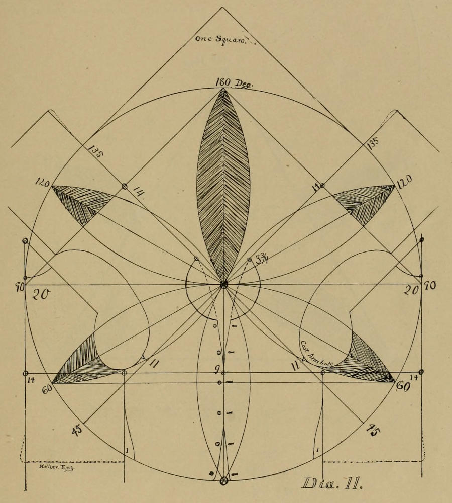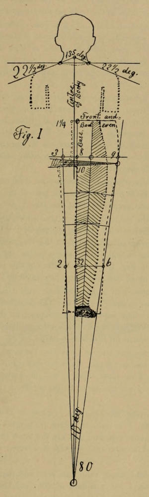 Like Columbus, I had an idea that there was something beyond, but had no conception of its form. Of geometry I knew nothing, except, that “a square is an angle of ninety degrees, or the fourth part of a circle,” but I found that I was helpless without geometry, and, at so late a day for me, I had to roll up my sleeves, as it were, and learn at least enough of geometry as this work requires. (Who will throw the first stone at my ignorance?) After I was able to divide the circle, the Bases, as laid down in this work, were gradually adopted, one by one, and so arranged that they harmonize with the slopes of the body. I have a hold now, and I can always tell whence I came, and whither I am going. I have a starting point at the center of a circle, I can tell that I sink my shoulders twenty-two and a half degrees; that the center of back and the center of front rest on one angle of one hundred and thirty-five degrees; that the front of armhole is forty-five degrees from the front, etc.; all of which may be understood by the whole civilized world. And if some cutters and tailors do not understand it, they can learn it in a few hours, and can learn it as quickly as they can any other rule.