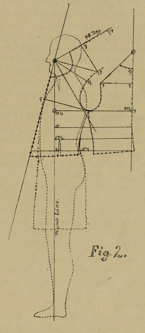 I call this work a scientific calculation within both the square and compass. But I do not claim any knowledge of science, nor even of geometry, except perhaps what may be called “home-made.” What little I know about geometry, I learned after I became forty-five years of age, and had begun to jot down my experience. Neither do I claim to be a Fancy Cutter; I do not even claim to be a Fancy Tailor; nor do I believe that I ever was cut out to be a tailor. But somehow I started to learn the trade, and when I was once at it, I made up my mind to learn it as well as anybody, even if it took me a few years longer perhaps than some others. Yet all of this is no reason why I should not be able to make a better survey of the human form than any other man has done so far; and in fact anyone, not a tailor, could have done so if his interest had been directed that way. It is a fact that the sewing machine was not invented, nor perfected, by tailors. It was accomplished by others, who knew nothing of tailoring, but they learned to make one good stitch in a quick way, and that was all.