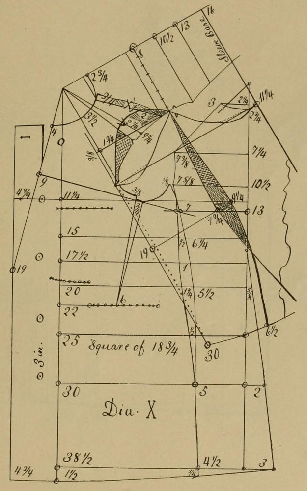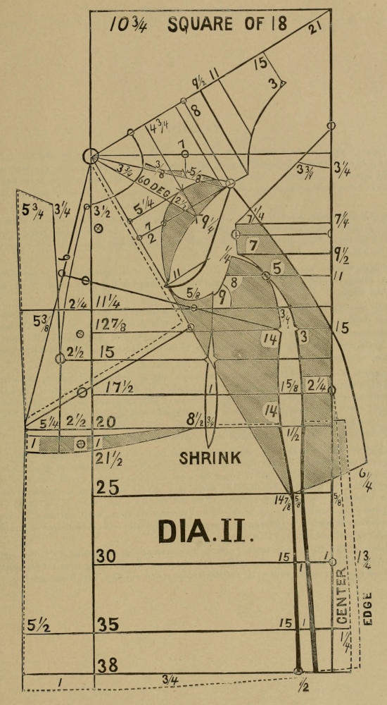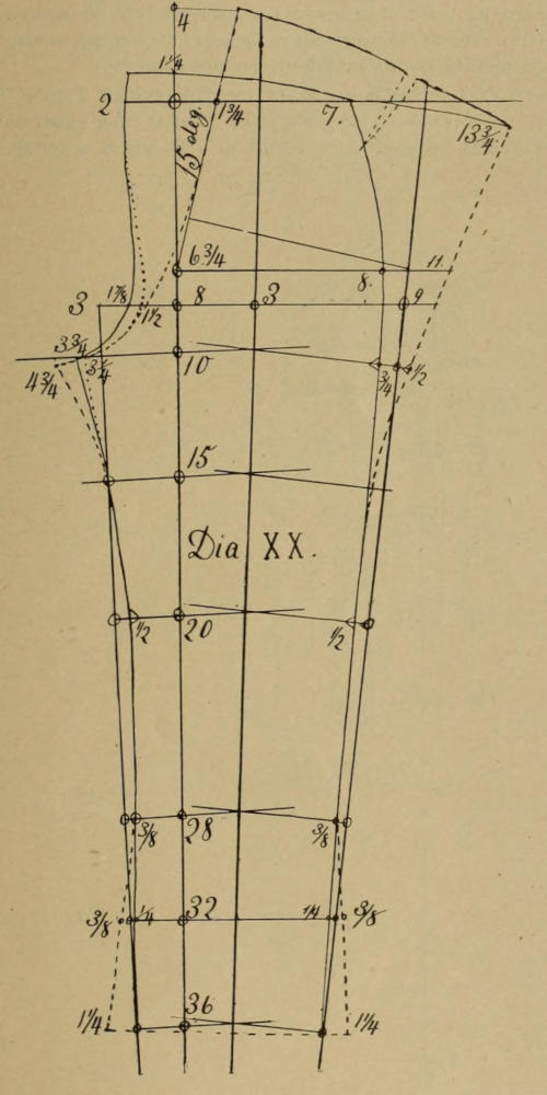 On top of front, the pants diagrams are thrown forward from five-eighths to two numbers. Persons who stand very erect, and have small waists, have enough if one-half is thrown out. Large waisted persons stand naturally very erect, and a form of forty-four seat, and forty-six waist, made up, can be fitted with one and one-half, while two numbers, like Dia. XX, is enough for forty-six seat and fifty waist, made up. Forty seat, forty hip and forty waist, made up, can be fitted with one and one-fourth, and the same is true of thirty-seven seat and thirty-seven waist, made up, all such waists to have the angle of seven and one-half degrees complete at the side, or even one inch allowance, as per Dia. XX. The gore in the back is to be one inch at the top of fore-part and running out to nothing at the top of back, and which may be called extra looseness, but which can not be drawn backward under the buckle strap, but will remain at the side and prevent the waistband from striking the short ribs.