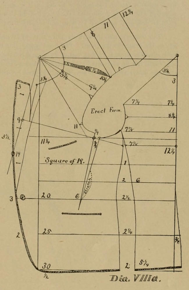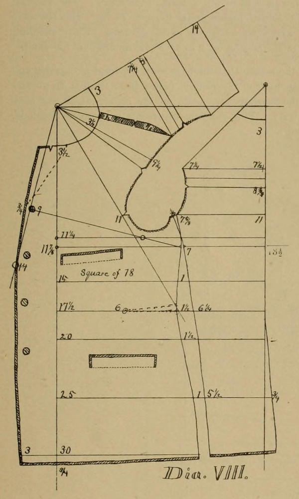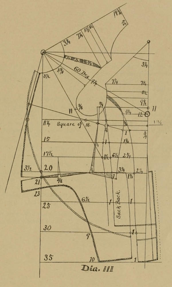 But it illustrates another point. On Dia. III there will be seen an opening in the under arm seam running up in the arm hole, and which opening is balanced for the three-seam sack by reducing that amount between the back and side seam. But the fifth seam on Dia. VIIIB, balances that part and the back and the side are cut on one line, from line 11¼ up. It gives a real good shape, and the whole diagram may be accepted as good, but the measure must be taken close. For the last year I have closely watched the effects of longer or shorter backs, and I must here repeat that 15 for a frock and 14 for a vest, and 13½ for a sack are good averages. Further: That a more erect form may easily have ¼ less, and a more forward, leaning form ¼ more, and a form like the third form in “Models” may have ½ to ¾ more length.