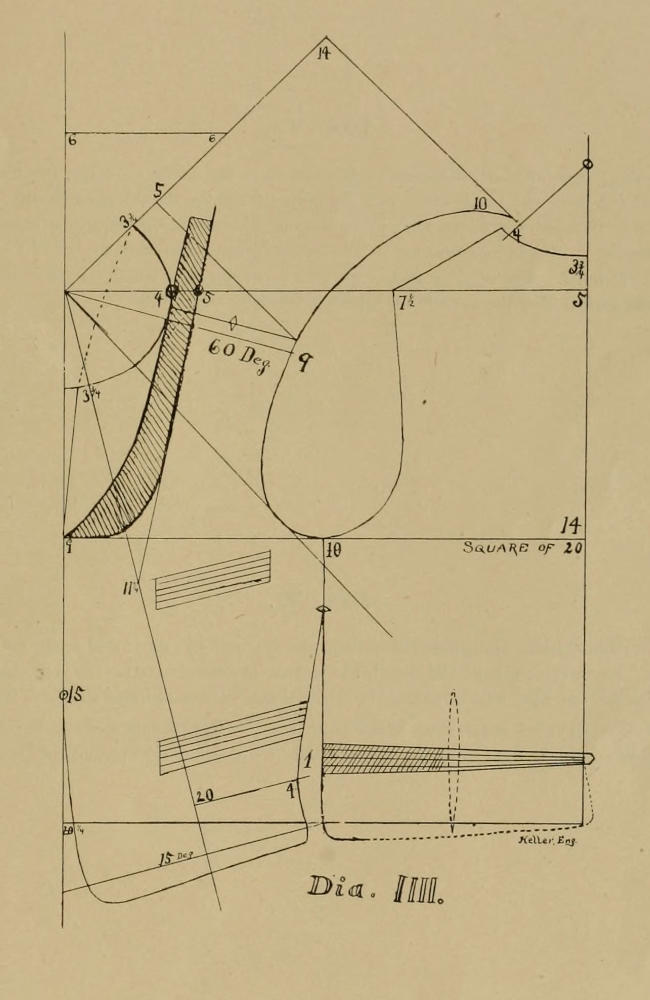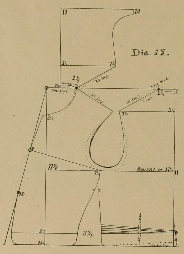 Dia. IV. wird in jeder Hinsicht ein gutes Muster schneiden für den normalen Körperwuchs. Die Weite des Hinterteils am Halse sollte niemals weniger als 3¼, und mag 3½ sein, und wenn der Rücken an das Halsband, oder an den Kragen genäht wird, so “muß” das Halsband ¼ bis ⅜ angehalten werden, nicht an der Mitte sondern mehr nach der Seite, so nahe als möglich nach der Schulternaht zu. Oder noch besser gesagt: der Rücken sollte soviel gestreckt werden, und um dieses am rechten Platze zu tun, muß der Rücken so weit als möglich geschnitten werden. Sollte man sich nicht auf den Westenmacher verlassen können so erlaube man lieber ¼ bis ⅜ Zoll mehr Länge am obern Ende der Schulternaht welches aber zu nichts in der Mitte dieser Naht aus laufen muß.