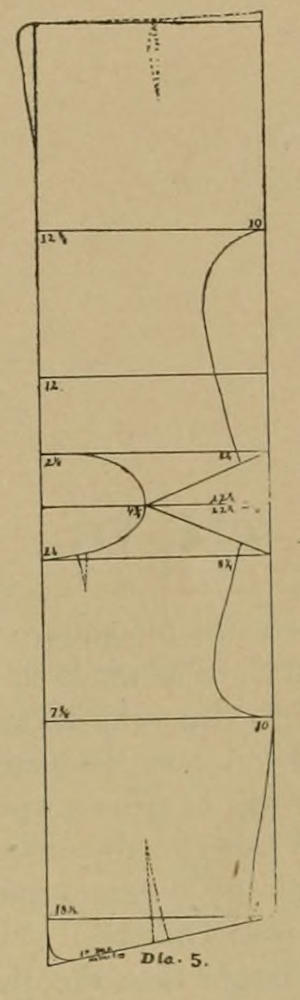 Um einer eingesunkenen Brust eine Weste anzupassen, nehme man einfach dia. IV. und lege eine Falte in das Muster von vieleicht ½ bis 1 Zoll, jenachdem der Brustkasten eingesunken ist. Diese Falte muß die Form eines V haben, und muß sich zu nichts auslaufen am untern Ende des Armlochs, ohne das die Seitennaht davon berührt wird.