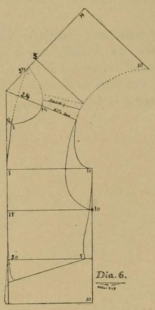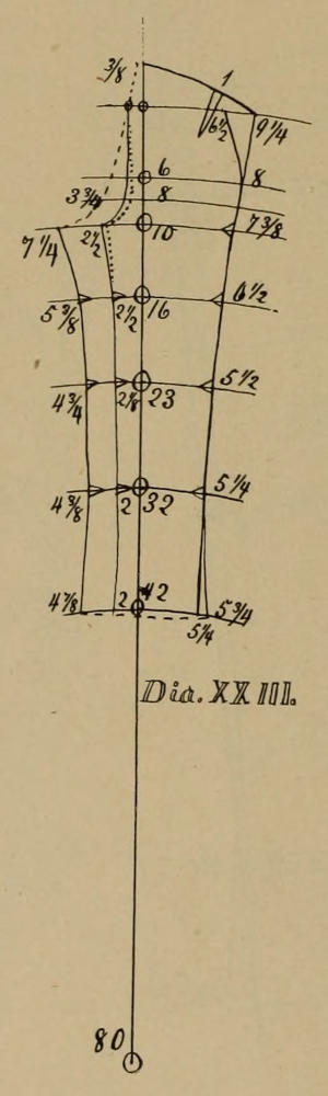 Man wird niemals verfehlen den Aermel in das Armloch zu passen wenn man dia. II. VII. und X. beobachtet. Dia. VII. zeichnet ein kleines Armloch welches sehr gestreckt werden muß, während dia. II. ein größeres Armloch giebt, aber mit demselben Aermel und daher nicht so viel gestreckt werden braucht.