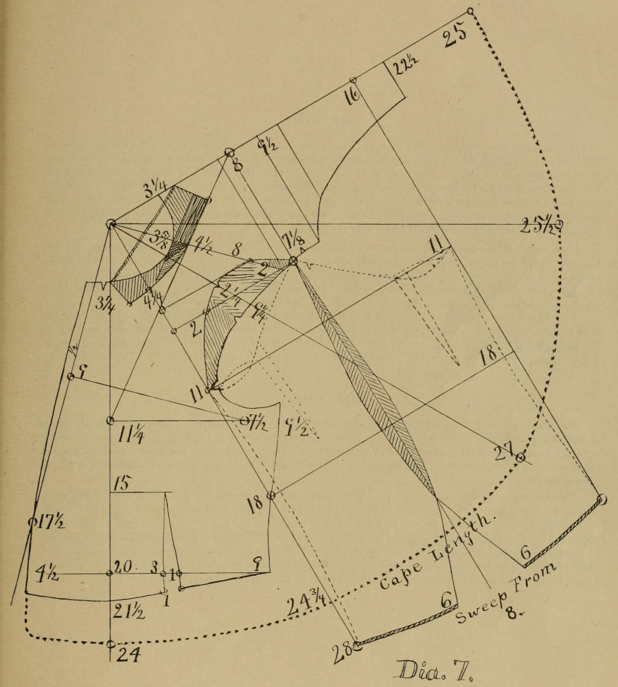 I also give Dia. VII A, of which Dia. VII is the parent pattern. This Dia. VII A requires no particular description, except that the back of Dia. VII is swung from point 10½ at the armhole shoulder seam, and the ordinary spring in the shoulder seam is added. In the position of Dia. VII A the cutter may easily throw the shoulder seam more forward at the armhole if he so desires it. The neck band must be a straight piece, as wide as button holes can be worked in, and the neck band must be put on loose at the side of the neck. The width in front, and the depth of the neck in front must be regulated according to the coat. The depth of the front of neck is placed at 3, and is as high as any cape may stand, but it is easy to cut it ½ lower. A cape may be cut without neck band by allowing say ⅝ inches on top of top and side of back, and by allowing a ⅝ short spring in the shoulder seam, and giving a good stretch besides.