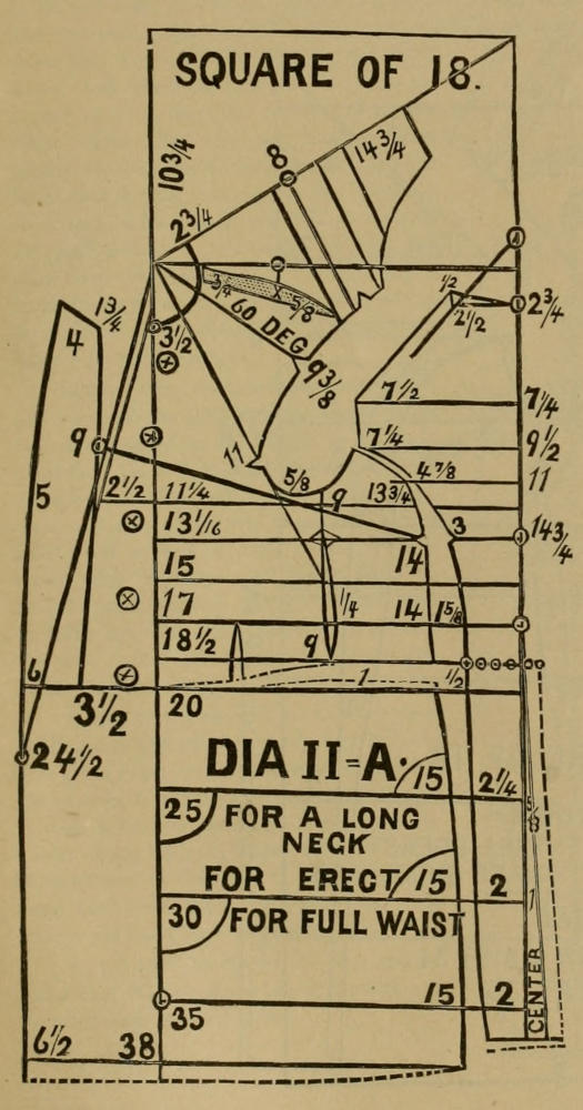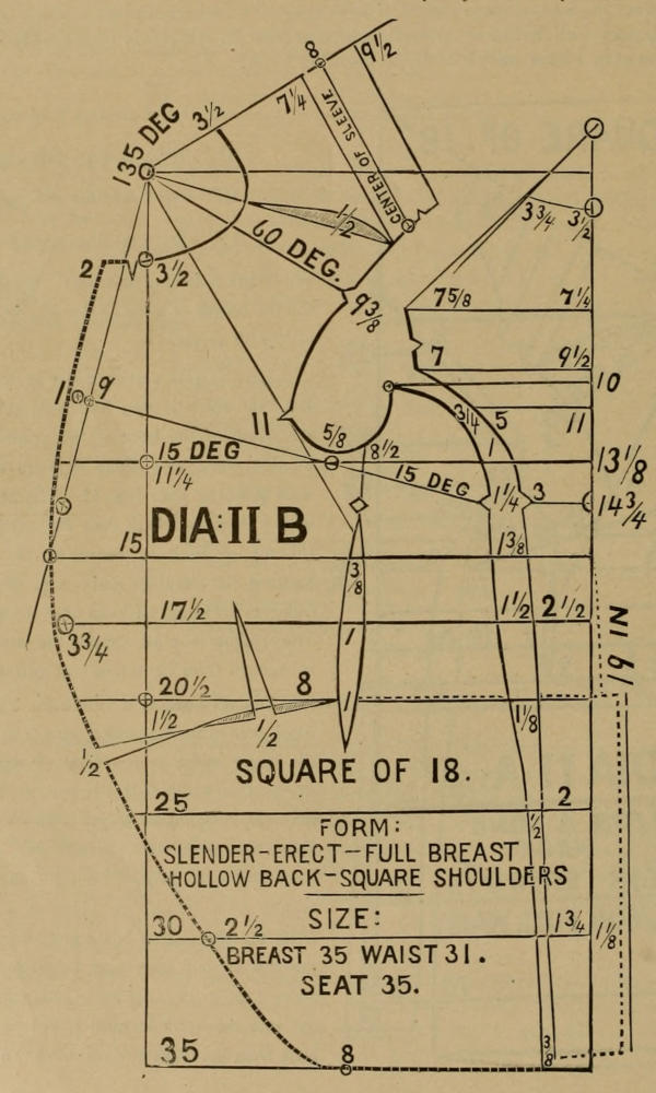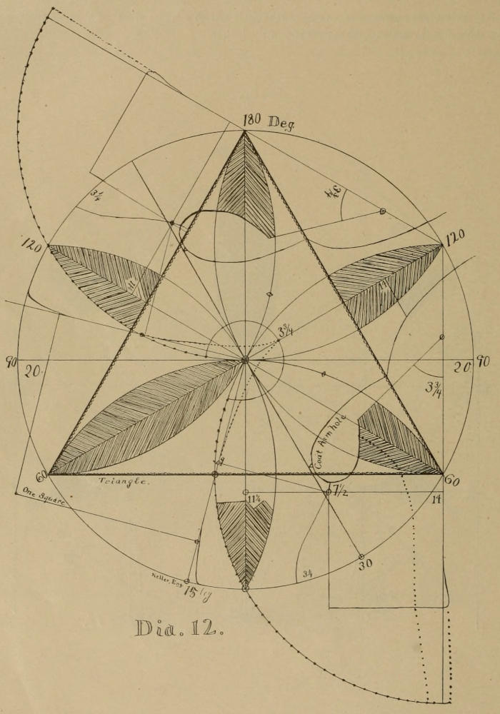 Form a right angle; from its point draw a circle as large as you can, and form two points, as shown in Dias. XI and XII; draw a line from the starting point to the second point of the circle, which will make one angle of one hundred and twenty degrees, to which is added fifteen degrees in front, to make the angle of one hundred and thirty-five degrees. The fifteen degrees are two lines spread one-quarter of their length, as a part of a circle twenty inches long and five inches wide. The angle of one hundred and thirty-five degrees is also one square, and one-half square, and may be found as follows: From the center of back and through the starting point draw a right angle, as shown by the front sleeve bases in all the diagrams, and on that line, go down, and square across and forward at equal distances, say twenty inches, and through that point draw the front line of the angle of one hundred and thirty-five degrees. Forming a right angle, and marking each line at equal distances, and drawing a line through said equally distant points, is equal to cutting a square in two from point to point, and consequently, said points will form an angle of forty-five degrees. The square contains ninety degrees, and the half square contains forty-five degrees, and the whole of it is one hundred and thirty-five degrees. (See Dia. II-A.) In all cases where an angle is to be found, the dimensions should be taken on a large scale, because on a large scale the variations are less than on a small scale.