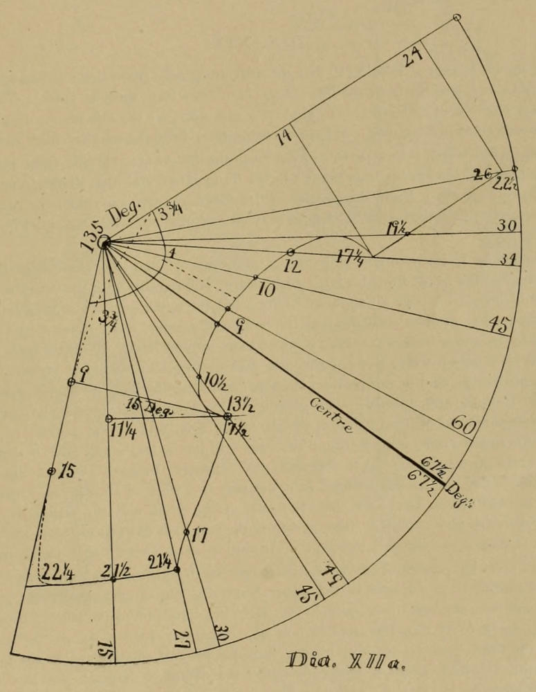Um die verschiedenen Winkel, welche in den 135 deg. enthalten sind, recht zu bekommen, nehme man einfach dia. I. oder irgend ein anderes, welches die Einteilung der 135 deg. zeugt, und mache die Lienien so lang, wie sie erforderlich sind, um ein Muster in voller Größe zu zeichnen.