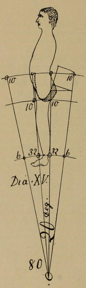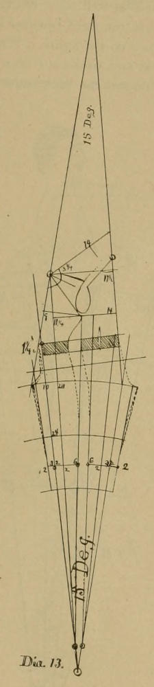 This angle of ten degrees, with its proper width, will cover a bare leg, and if it does not exactly fit it, it will at least represent the same slopes, and by these, reductions at the knee and additions to the bottom can be made. For the point of the double dress fork one and one-eighth to one and one-quarter is to be allowed, outside of the angle of ten degrees, and three-eighths less for the double undress side, and whatever the forepart is made smaller is allowed again on the back. The points of the forks must be so constructed that they all rest on the same sweep, as shown in Dia. XIV, unless the front and the back are made extremely wide or narrow, in which case the points can not rest on the sweep, but must be put as shown in Dia. XIV. The allowance of one and one-eighth to one and one-quarter for the double dress fork is simply an average quantity and one is enough for a close fit, while a very loose fit, or open cut, may have one and three-eighths allowed. That part of the pants can not be cut to fit close to the body, but must always have some loose cloth there, but it must be cut so that it will hang[15] straight. Years of experience have taught me that one and one-eighth to one and one-quarter is a good average. The same cause, which requires the front of the waist to be thrown forward of the base on 7½ deg., requires the addition to the fork, and to the angle of 10 deg., and the normal form requires about the same amount at the waist and at the undress side. If the front base were moved forward to the front of waist, the angle of 10 deg. would also move forward to the half undress fork. The extra allowance for the dress fork must be considered independent of the body, as it is a one-sided affair.