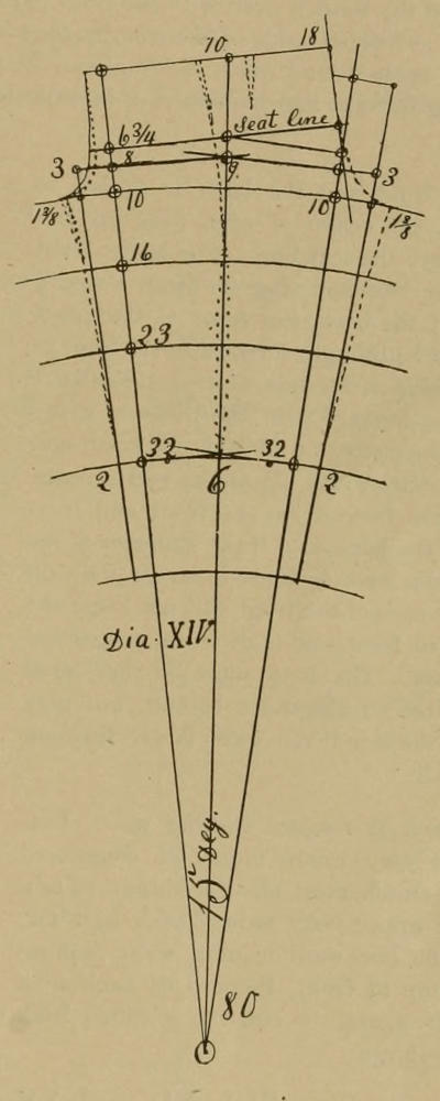 To shape the crotch seam Dia. XIV should be observed, especially when the fore part is to be cut larger and the back that much smaller, which sometimes may be done to advantage, and may enable the cutter to cut the back without much piecing. In the shape of Dia. XIV the seam may be thrown anywhere, without losing the balance.