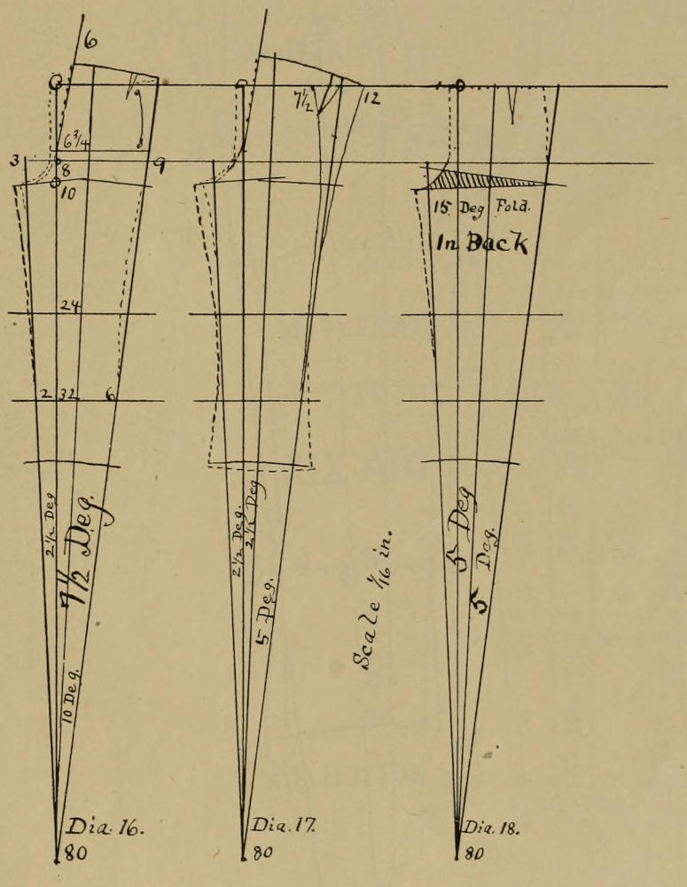The angle of seven and a half degrees, with its width of ten at the top of the waist and the back slope of fifteen degrees taken off, and the back seam formed as shown in the diagrams, will produce the two seat lines about nineteen and one-half numbers for the dress side, of which must be used about one and one-quarter inches for all seams, leaving three quarter inches for extra width over the seat for the half pants, which is enough.