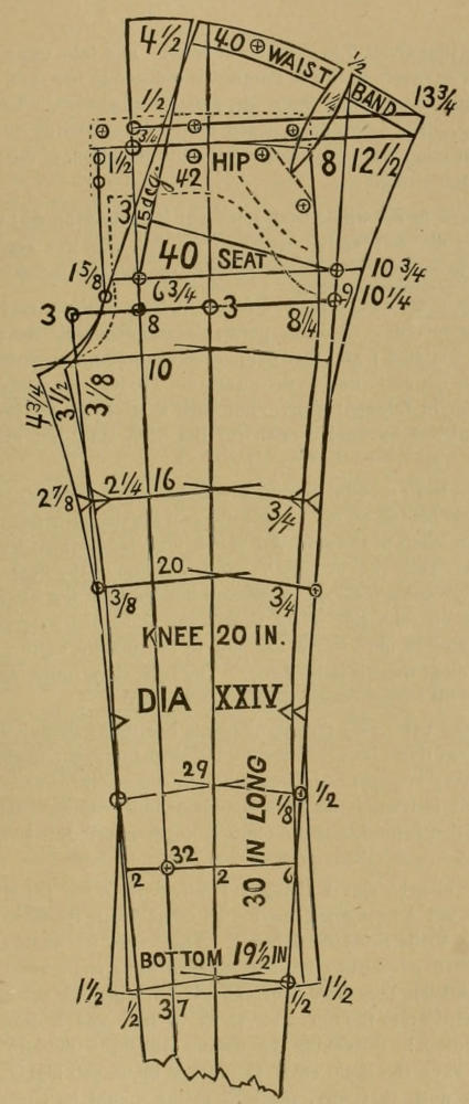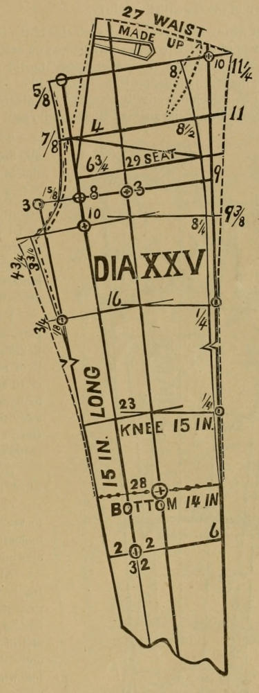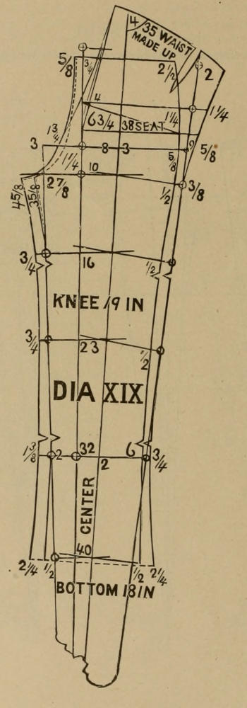 At the side of the knee the angle of 10 deg. may be hollowed out ⅝ to ¾ on each back and on each front, or so much as the inward curve of side of the knee will warrant. At the inside of the knee allow ¼ to ⅜ on the double to the angle of 10 deg., all of which will produce a knee of about 18 inches made up, and that will be pretty close for a seat of 38. Again, if size 38 is reproduced for a size 35, the knee will be about 18½ inches made up, and if from this is taken away ½ inch on each forepart and on each back at the side of the knee to represent the hollow of the leg there, and which is not shown in the present style, the knee will make up 17½ inches which again is a fair width for a narrow leg for size 35.