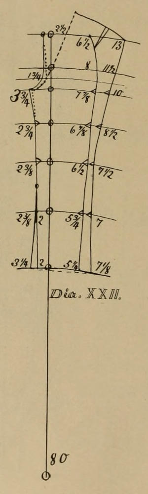 I will again warn a cutter against giving more fork for extra looseness, nor to allow behind on top of back for extra waist proportion, but to allow all extra cloth at the side, unless it is for a large waist, when it is to be cut like Dia. XX or XXIV. The top line of the back slope of 15 deg. is large enough for all forms, and besides it is large enough to buckle up ½ on each side of the back seam, and which may be cut away there, or may be cut away in the gore in the middle of the back when an extra close waist is to be made. The back slope must remain permanent, and all changes made sidewise or forward.