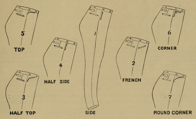 This is also true when you cut spring bottoms. Spring bottoms have come and gone regularly for the past forty years, and they will soon come again, and when they come again some cutter or tailor will be glad to know something about them. When spring bottoms were first introduced they were made with a piece or wedge set in the center of the fore part, on the same principle as leggings are made to-day, but it was soon discovered that by allowing that wedge on each side of the back, and by stretching the sides of each fore part toward its center, the side of the fore part would spring forward, and the wedge added at the side of the back filled the vacancy at the stretched side. If there could be a seam in the center of the fore part we would simply add say one-half to three-fourths more on each seam in front, and the spring would be there; or if we could cut our fore part to a point at the bottom, leaving the whole width at the back, the spring would also be there, and all without stretching or shrinking anything, because the spring would be cut where it belongs. But style and economy of material require all seams to be at the side, and for the reason that the spring must be worked toward the center of the front, all such fore parts must be as narrow as possible, because a narrow fore part of six inches will stretch more[12] easily than a fore part of eight inches. Now, in springing the bottom and forcing both seams of the fore part forward as a spring, all must be done by stretching the sides of the fore part before the seams are sewed, and in such manner that the fore parts will fit into the spring on the back. It will be of no practical use to do the stretching at the sides but a part of the way, and attempting to force the spring forward by shrinking the center of the front, as all such shrinking will return. Nor will it do any good to hold the back full on the fore part, and sew the seams, and then attempt to stretch the fore part; for, even if the stretching could be accomplished in this way, the sewed-up seam would soon draw back, because a sewed seam, and particularly a machine-sewed seam, can be stretched but very little, and if it does stretch will soon return to its former condition. The stretching of the side of the fore-part must also be alike on both sides, as well as alike on both legs, or else the springs will not run in the same direction; or they may not spring to the center of the foot, but to one or the other side. The stretching must also be done as far down as possible, and must never be started higher than about five inches above the bottoms, all of which must be indicated by correct nicks in the front and back.