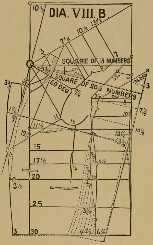 Obgleich die Weiten der Schultern besser mit diesen Maßstaben ermittelt werden können, als mit irgend einem andern Maße, oder mit irgend einer andern Berechnung, so will ich dennoch hier erwähnen, daß alle Größen von 23 bis 44 mit dem Verhältniße deß Maßstabes erzielt werden können; aber wenn man über 44 Brustweite hinauf kommt, so sollte man an dem Armloche und derjenigen Linie, welche mit 60 deg. bezeichnet ist, 1-16 für jede höhere Nummer abrechen, so daß ein 50 Brustmaß nicht über 8¾ an dieser Stelle erhält, und der Rücken sollte nicht über 6⅞ Weite haben am punkte 8, oder an dem Centrum des Aermels. Auch sollte die Tiefe des Armlochs in demselben Verhältniße erhöht werden. Während das vordere Armloch an der Lienie von 45 deg. bleibt, wird dann der vordere Aermelzwick vielleicht ¼ bis ⅜ höher gestellt. Wenn dieses beobachtet wird, so wird die Schulter niemals zu breit werden für die größeren Nummern.