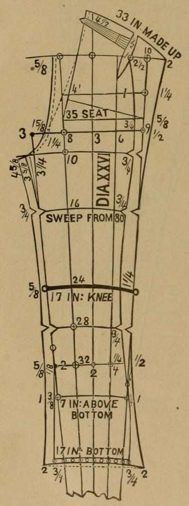 For spring bottoms allow on each side of the back, starting about 5 in. above the bottom, and take away from the bottom of the forepart an equal amount on each side, or so much until the forepart is reduced to less than 7 in. Dia. XXVI is marked “7 in. above bottom” for the reason that the width of the pants, about 7 in. above the bottom, must be the same, no matter if the legs are 30 or 35 in. long. The seams are notched from a sweep having its pivot at point 80, which of course is cut off on this diagram. Sweeping each side separately from the bottom of the pants and on each line of the angle of 10 deg. will result in the same thing.