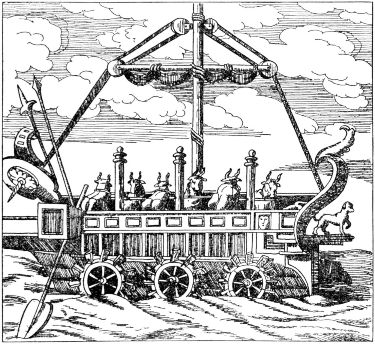 Among eccentricities of design in steamboats may be mentioned cigar ships, vessels shaped like birds, early submarines, double-hulled boats, and numerous other extravagances. One of the earliest submarines was contrived by a Dutchman named Hollar, about 1653, but whether this wonderful vessel ever got beyond the imaginative or paper stage is unknown. There is a picture of it in the British Museum. This singular craft was to be 72 feet in length, 12 feet high, and 8 feet beam, with a wheel in the centre where it “hath its motion.” The description says it was built at Rotterdam. The inventor undertook in one day to destroy 100 ships. “It can go from London to Rotterdam and back in one day, and in six days can go to the[376] East Indies, and can also run as fast as bird can fly.” “No fire, no storm, no bullets can harm her unless it please God.” There is no further trace of her.