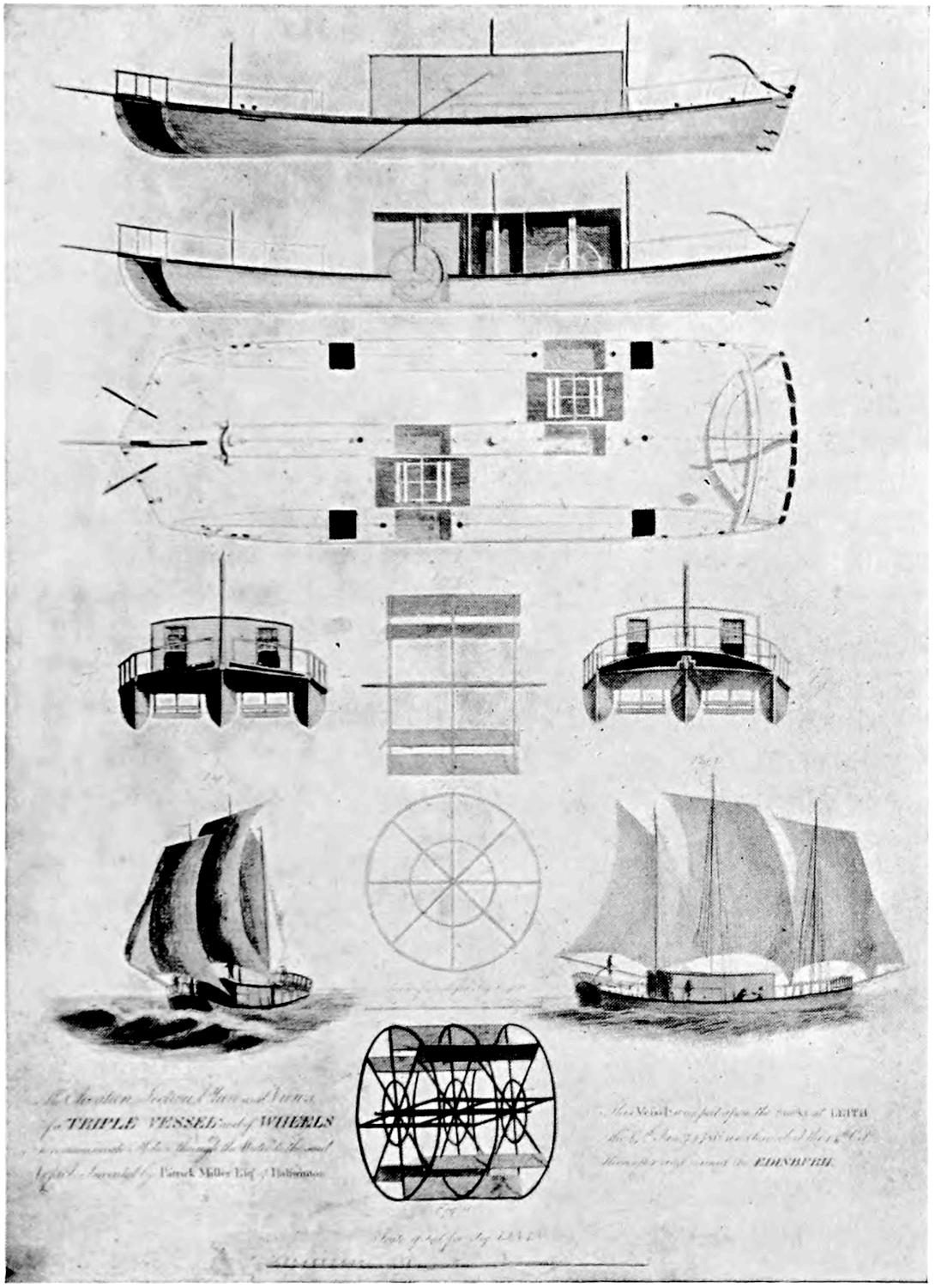 A proposal for fast Atlantic travelling, which has not gone beyond the paper stage, is that three long narrow hulls should be built parallel to each other and supporting the main body of the hull. The inventor claims that the method would enable a greater speed to be attained than by any existing liner, and at a less cost; but readers who have followed the development of the steam-ship will recollect that this suggestion provides a curious parallel to the experiments of Patrick Miller with his triple-hulled boats in the eighteenth century.