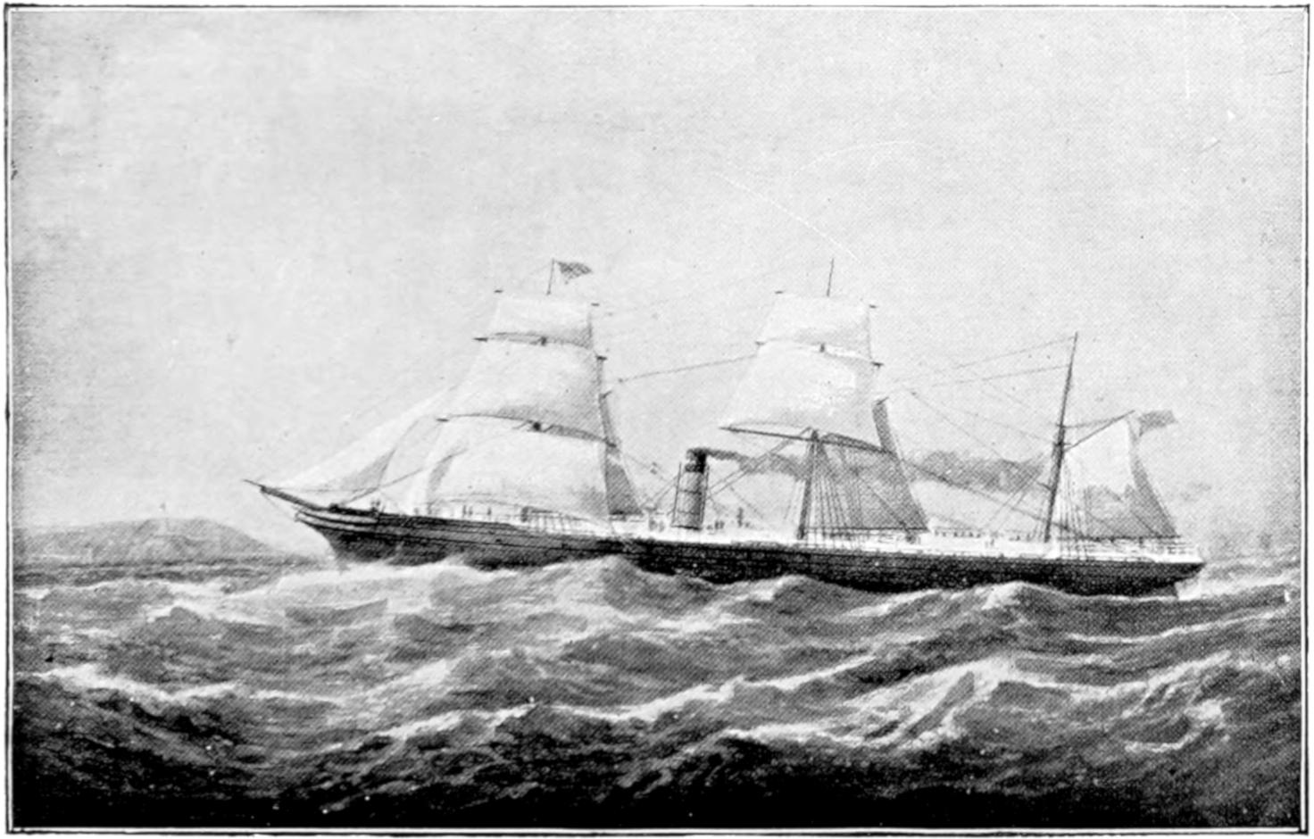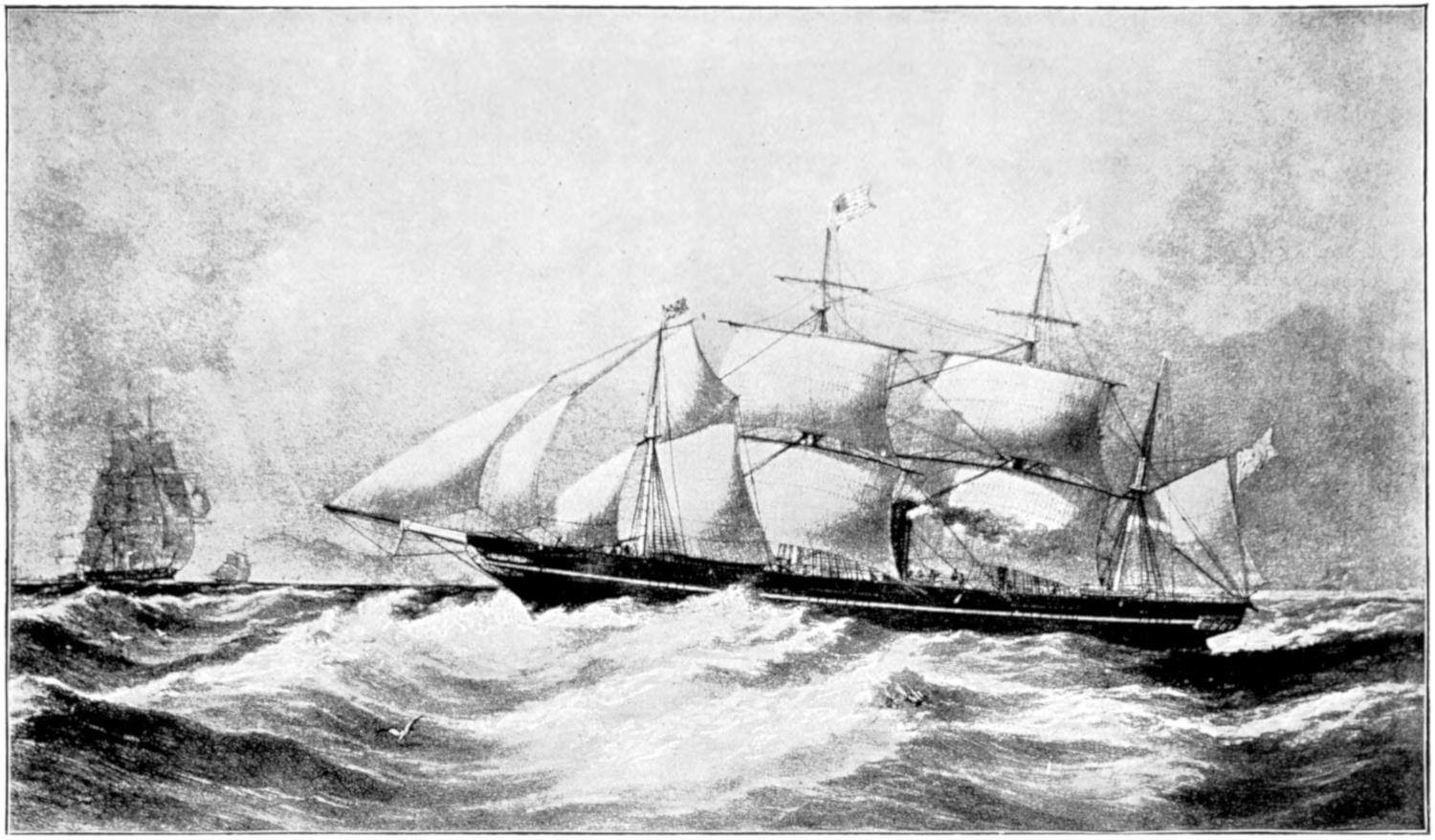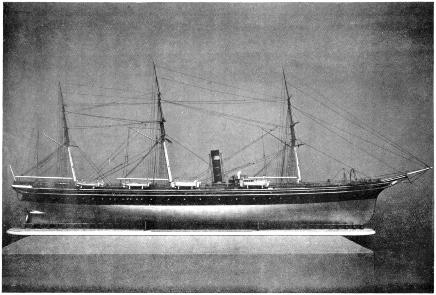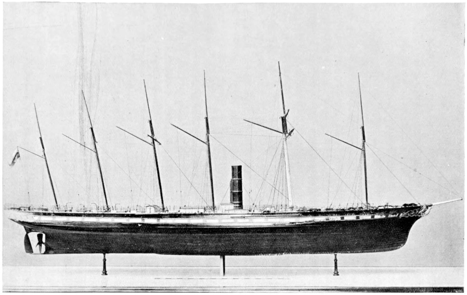 The earliest attempts were made, naturally enough, in the face of great opposition. Every one will remember Stephenson’s famous retort, when it was suggested to him that it would be awkward for his engine if a cow got across the rails, that “it would be very awkward—for the cow”;—and at sea it was the rule for a long while[vii] to regard steam merely as auxiliary to sails, to be used in calms. While ships were still built of wood, and while the early engines consumed a great deal of fuel in proportion to the distance covered, it was impossible to carry enough coal for long voyages, and a large sail-area had still to be provided. Progress was thus retarded until, in 1843, the great engineer Brunel proved by the Great Britain that the day of the wooden ship had passed; and the next ten years were marked by the substitution of iron for wood in shipbuilding.