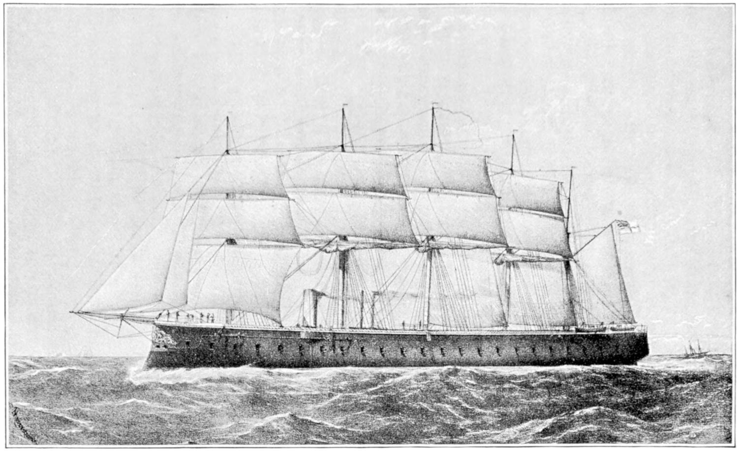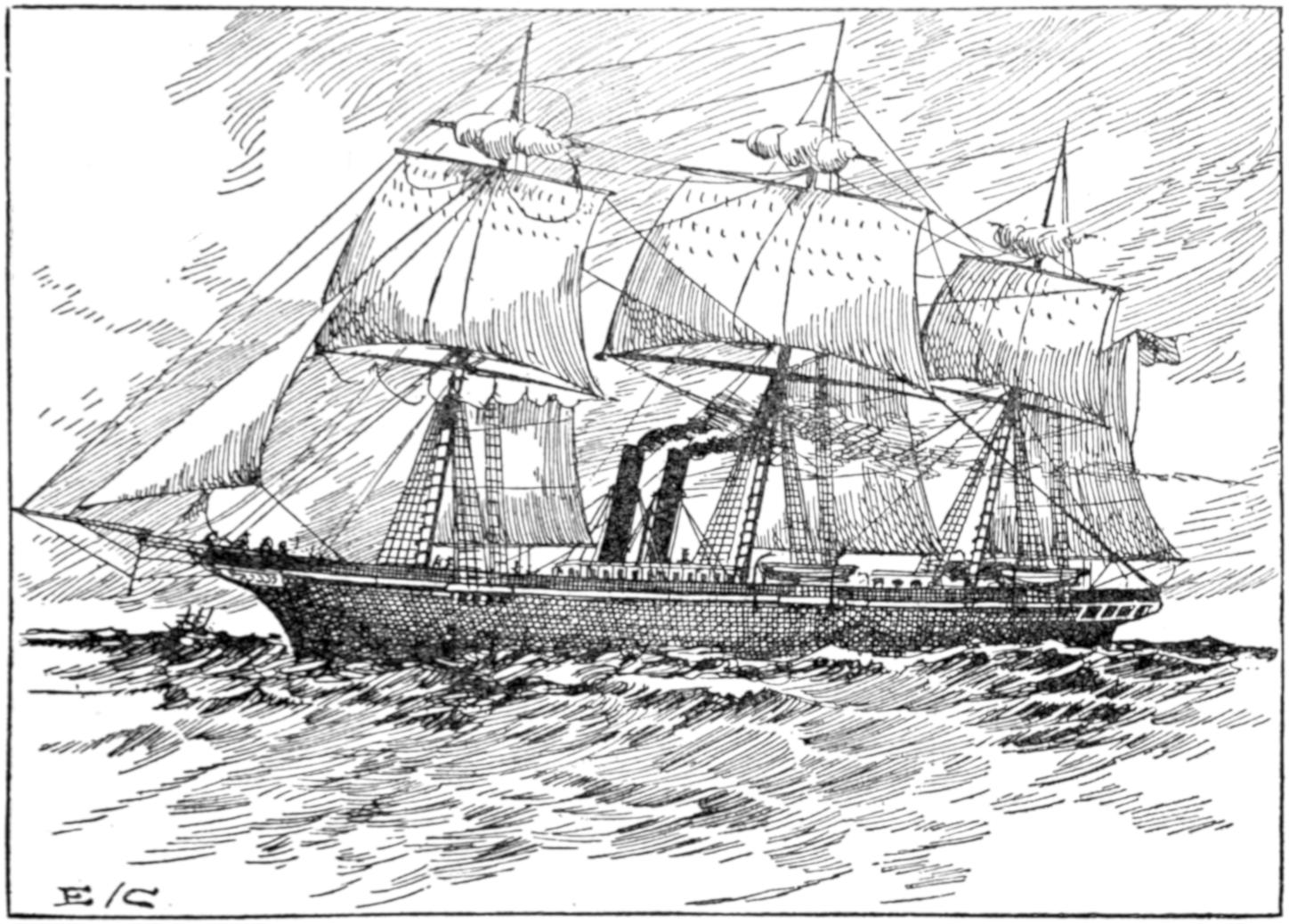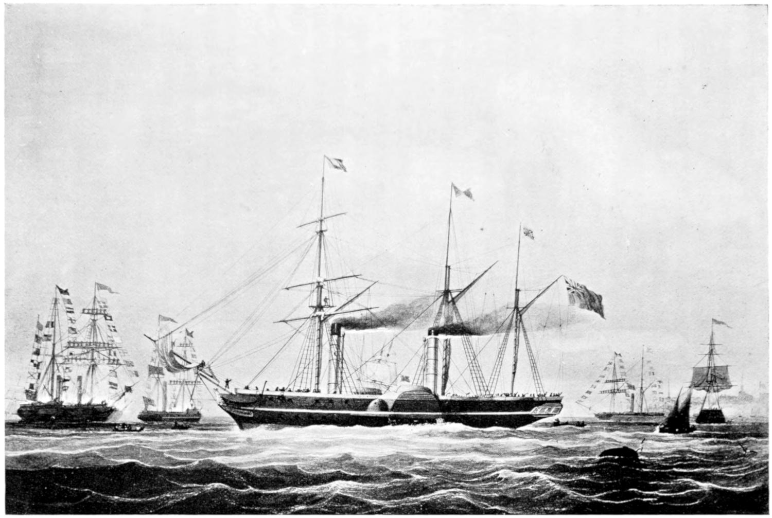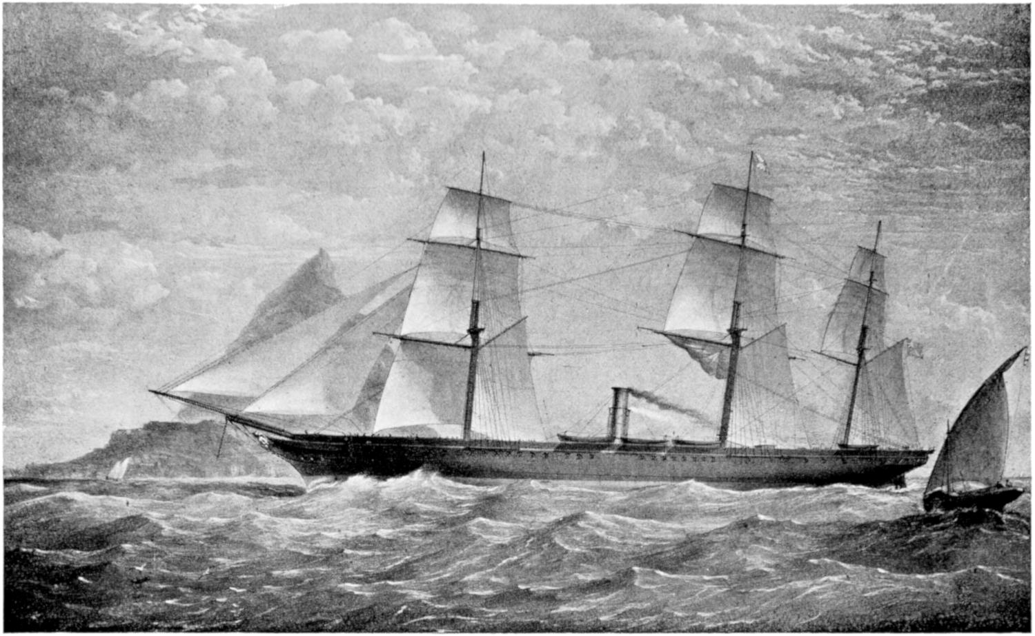 The earliest attempts were made, naturally enough, in the face of great opposition. Every one will remember Stephenson’s famous retort, when it was suggested to him that it would be awkward for his engine if a cow got across the rails, that “it would be very awkward—for the cow”;—and at sea it was the rule for a long while[vii] to regard steam merely as auxiliary to sails, to be used in calms. While ships were still built of wood, and while the early engines consumed a great deal of fuel in proportion to the distance covered, it was impossible to carry enough coal for long voyages, and a large sail-area had still to be provided. Progress was thus retarded until, in 1843, the great engineer Brunel proved by the Great Britain that the day of the wooden ship had passed; and the next ten years were marked by the substitution of iron for wood in shipbuilding.