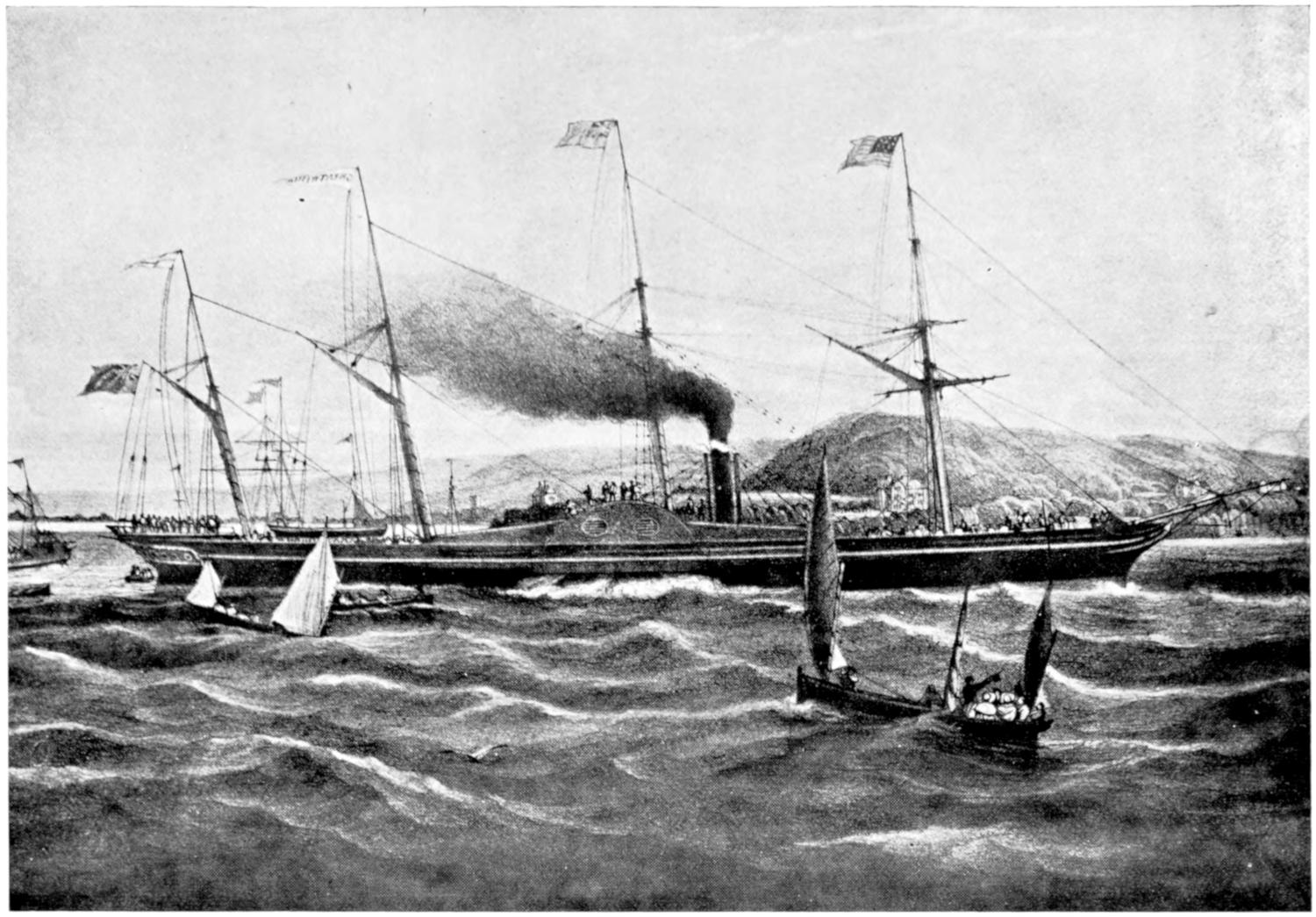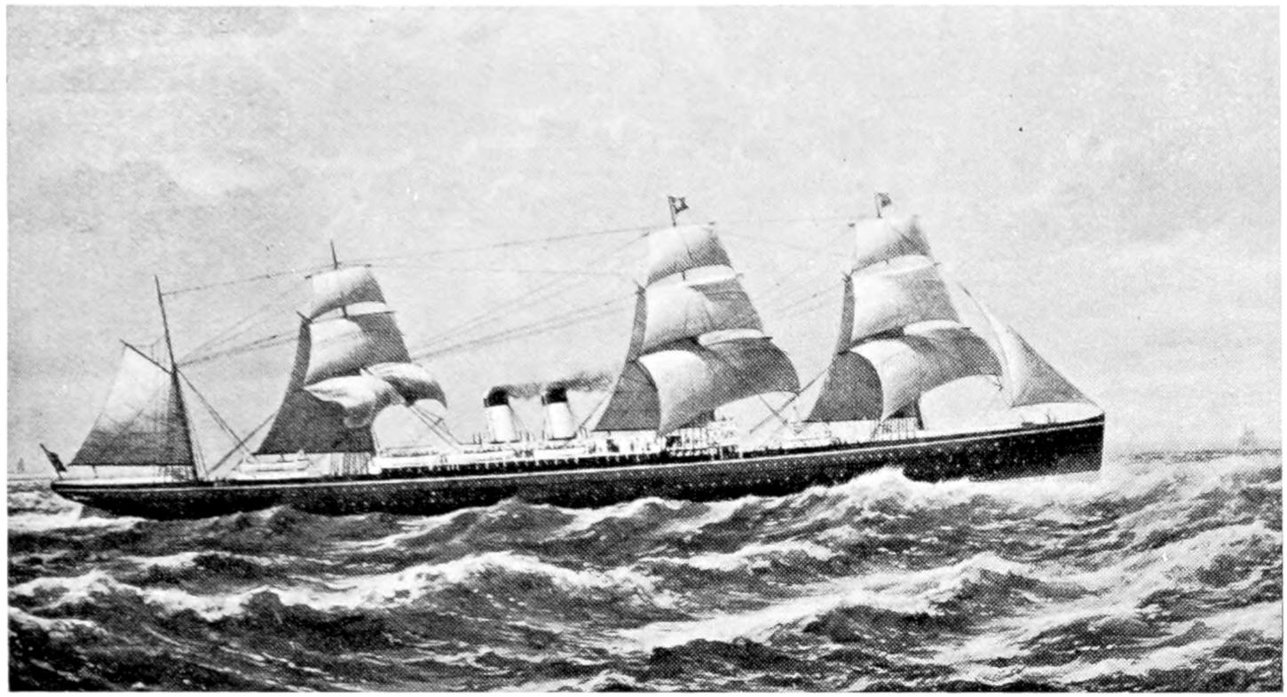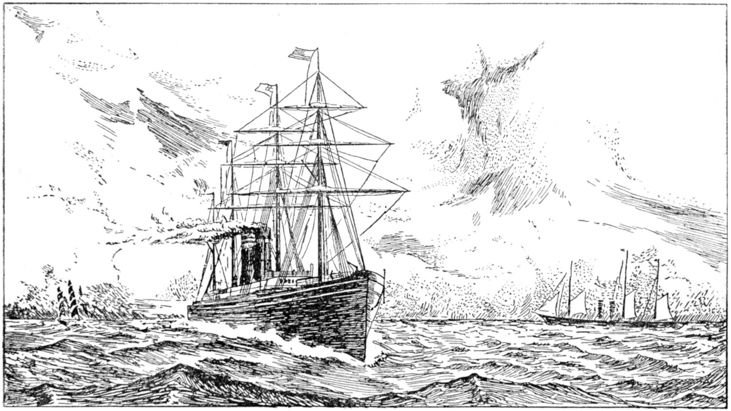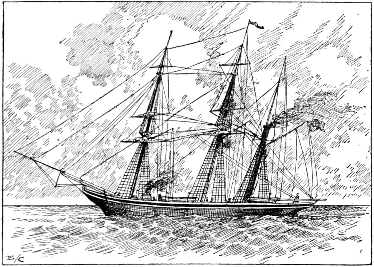 The earliest attempts were made, naturally enough, in the face of great opposition. Every one will remember Stephenson’s famous retort, when it was suggested to him that it would be awkward for his engine if a cow got across the rails, that “it would be very awkward—for the cow”;—and at sea it was the rule for a long while[vii] to regard steam merely as auxiliary to sails, to be used in calms. While ships were still built of wood, and while the early engines consumed a great deal of fuel in proportion to the distance covered, it was impossible to carry enough coal for long voyages, and a large sail-area had still to be provided. Progress was thus retarded until, in 1843, the great engineer Brunel proved by the Great Britain that the day of the wooden ship had passed; and the next ten years were marked by the substitution of iron for wood in shipbuilding.