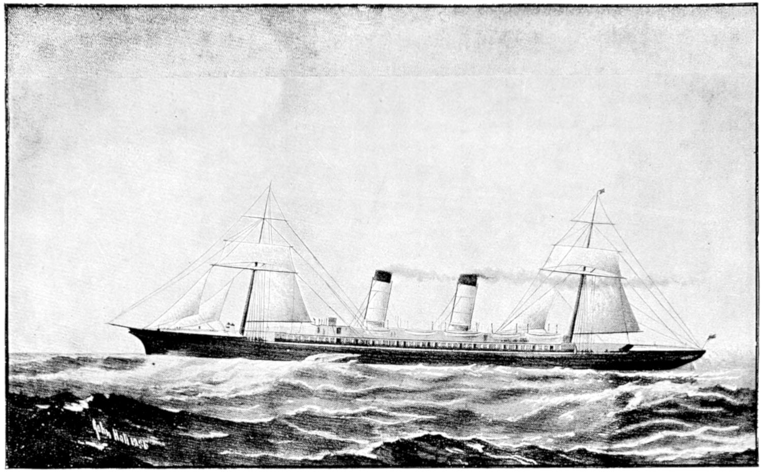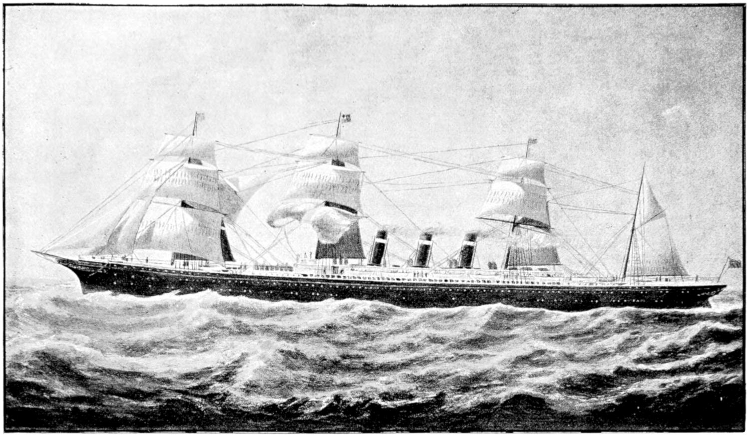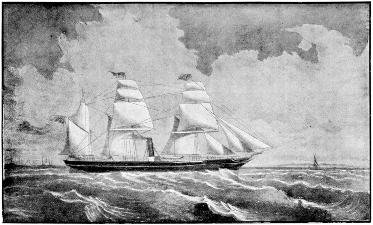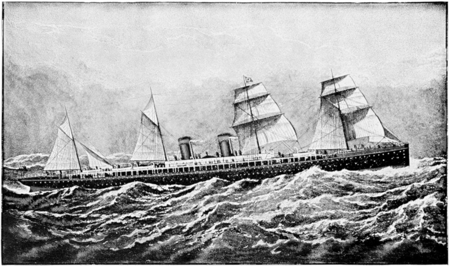 The earliest attempts were made, naturally enough, in the face of great opposition. Every one will remember Stephenson’s famous retort, when it was suggested to him that it would be awkward for his engine if a cow got across the rails, that “it would be very awkward—for the cow”;—and at sea it was the rule for a long while[vii] to regard steam merely as auxiliary to sails, to be used in calms. While ships were still built of wood, and while the early engines consumed a great deal of fuel in proportion to the distance covered, it was impossible to carry enough coal for long voyages, and a large sail-area had still to be provided. Progress was thus retarded until, in 1843, the great engineer Brunel proved by the Great Britain that the day of the wooden ship had passed; and the next ten years were marked by the substitution of iron for wood in shipbuilding.