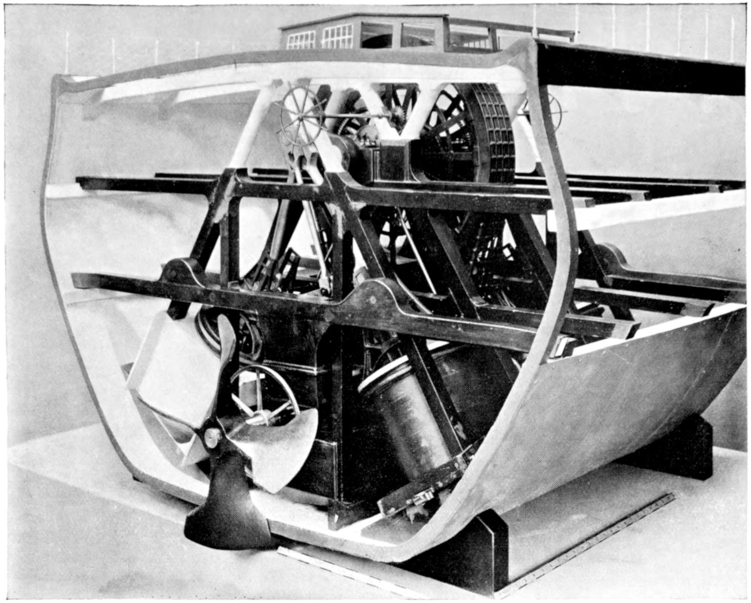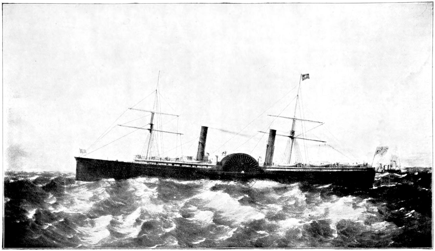 To the category of magnificent failures there should be added the steam-ship Bessemer, launched at Hull in 1874 and designed by and named after Mr. (afterwards Sir) Henry Bessemer. The object her designer had in view was to mitigate the horrors of the cross-Channel passage, and to accomplish this he fitted his boat with a spacious saloon which, by means of a series of pivots and a gyroscope, would remain in a level position without oscillation, no matter how much the vessel might roll or how rough the weather might be. These arrangements worked perfectly in theory, but immediately the Bessemer went to sea for her trials and the test became a practical one, it was discovered that she must be relegated to a conspicuous place among the successes that might have been. Everything about her was on a lavish scale. A peculiarity was that she had four paddle-wheels, two a side, an experiment that has never been successful. Her form also was against her, and in dirty weather she would have been a wet ship, difficult to steer, and almost helpless.