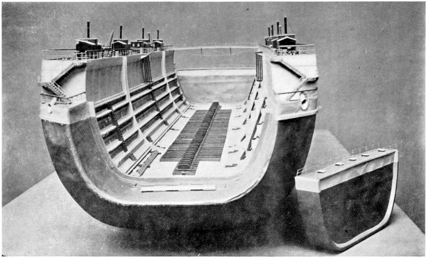 The only sea-going railway ferry-steamer in existence is the Drottning Victoria, launched in January 1909 from the Neptune Works of Messrs. Swan, Hunter, and Wigham Richardson, Ltd., to the order of the Royal Administration of the Swedish State Railways. She was built to ferry trains across the Baltic, between Sassnitz in Germany and Trelleborg in Sweden, a distance of 65 nautical miles. High sea-going qualities were necessary as the voyage is[366] occasionally a very rough one. The vessel is 354 feet in length by over 50 feet beam, and is propelled by twin-screw triple-expansion engines, supplied with steam from four large boilers working under Howden’s system of forced draught. The trains are carried on two tracks on the car deck, occupying nearly the whole surface of the deck. Above and below this deck is very luxurious passenger accommodation. The vessel has been designed to be very steady at sea, and has unusually large bilge keels fitted to minimise the rolling. Spring buffers and other necessary appliances are arranged to prevent the cars from moving when at sea. A bow rudder is fitted as well as the stern rudder, and both are controlled by steam from the captain’s bridge. The steamer has been divided into a very large number of water-tight compartments, which, with the bulkhead doors with which she is fitted, render her practically unsinkable. She is also to be fitted with a submarine signal installation. The ventilating and heating are ensured by an installation of thermo tanks, enabling fresh, warm air to be forced into all the rooms in winter and fresh cool air in summer. Her speed is over 16 knots per hour, and the journey is made within four hours.